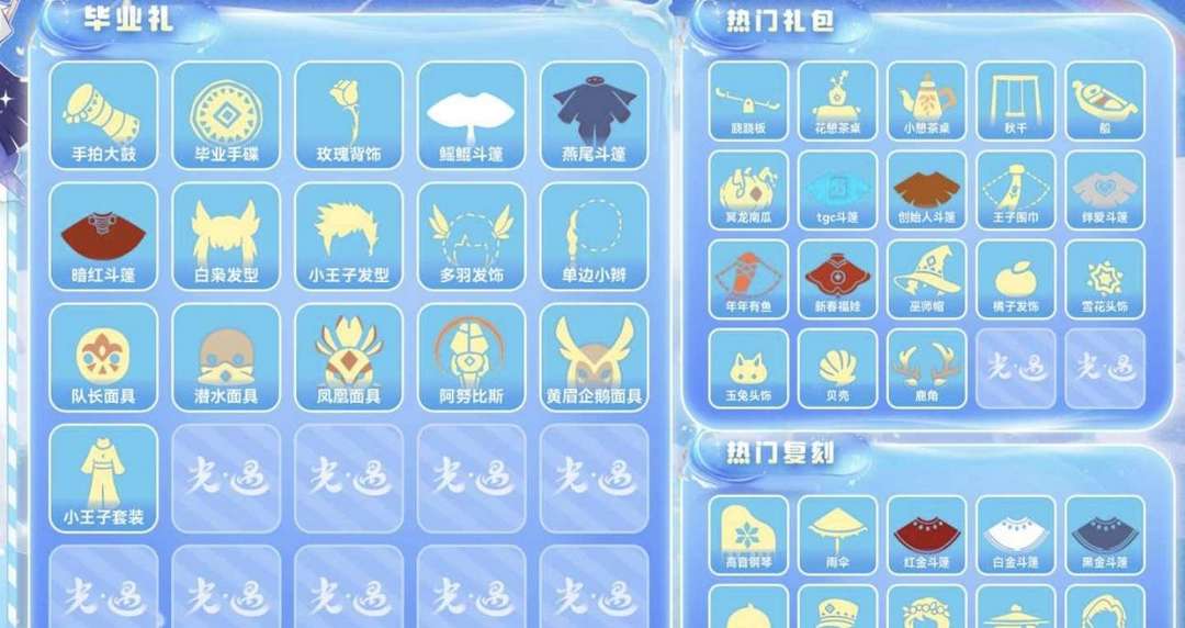 装备描述:毕业季:王子季,圣岛季,表演季,潜海季,预言季;毕业礼:手拍大鼓,毕业手碟,玫瑰背饰,鳐鲲斗篷,燕尾斗篷,暗红斗篷,白枭发型,小王子发型,多羽发饰,单边小辫,队长面具,潜水面具,凤凰面具,阿努比斯,黄眉企e面具,小王子套装;礼包:跷跷板,花憩茶桌,小憩茶桌,秋千,船,冥龙南瓜,tgc斗篷,创始人斗篷,王子围巾,绊爱斗篷,年年有鱼,新春福娃,巫师帽,橘子发饰,雪花头饰,玉兔头饰,贝壳,鹿角;热门复刻:高音钢琴,雨伞,红金斗篷,白金斗篷,黑金斗篷,正太,平顶帽,花环长发,箬笠,虚荣,红耳机,黄鼠狼面具,武士裤,搓澡巾