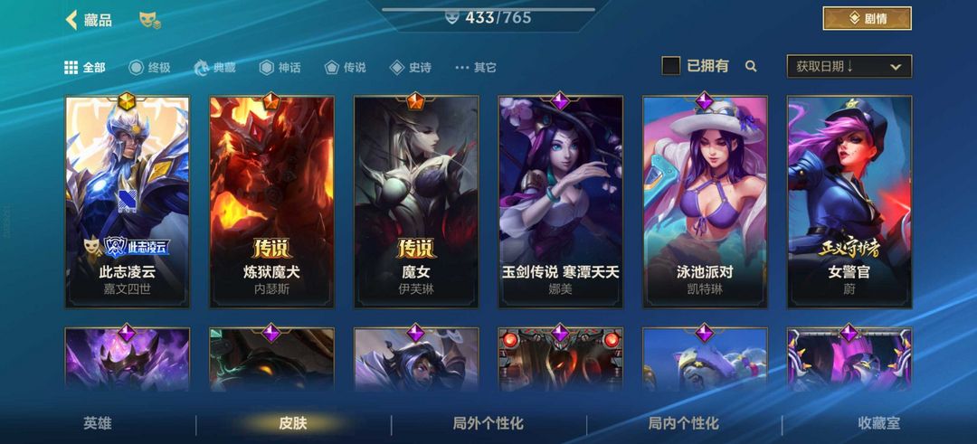 钻石可排 437皮50传说 豹女灵魂莲华 至臻辛德拉 杰斯全皮 皇子此志凌云 亚索兰亭序
