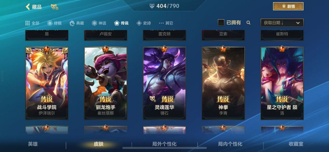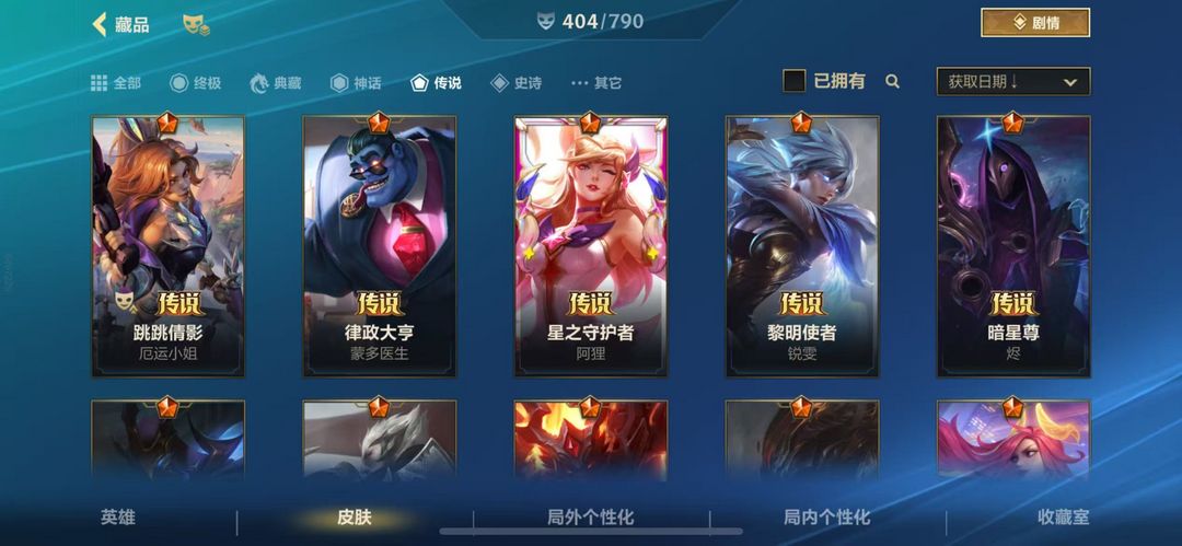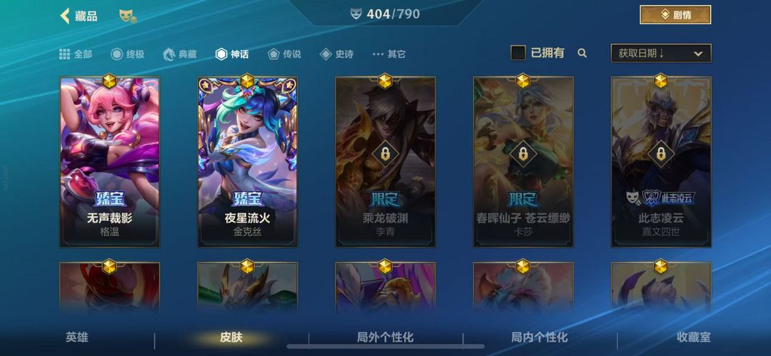 可排位,全英雄404皮,史诗基本上都有,传说自己看一下,一个免费的金克斯臻宝,一个格温臻宝