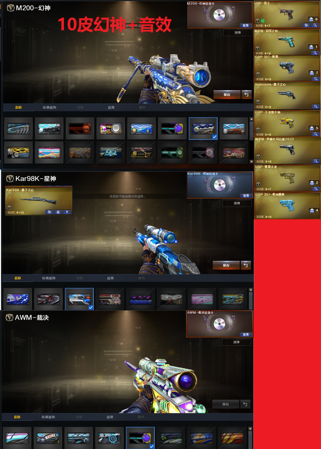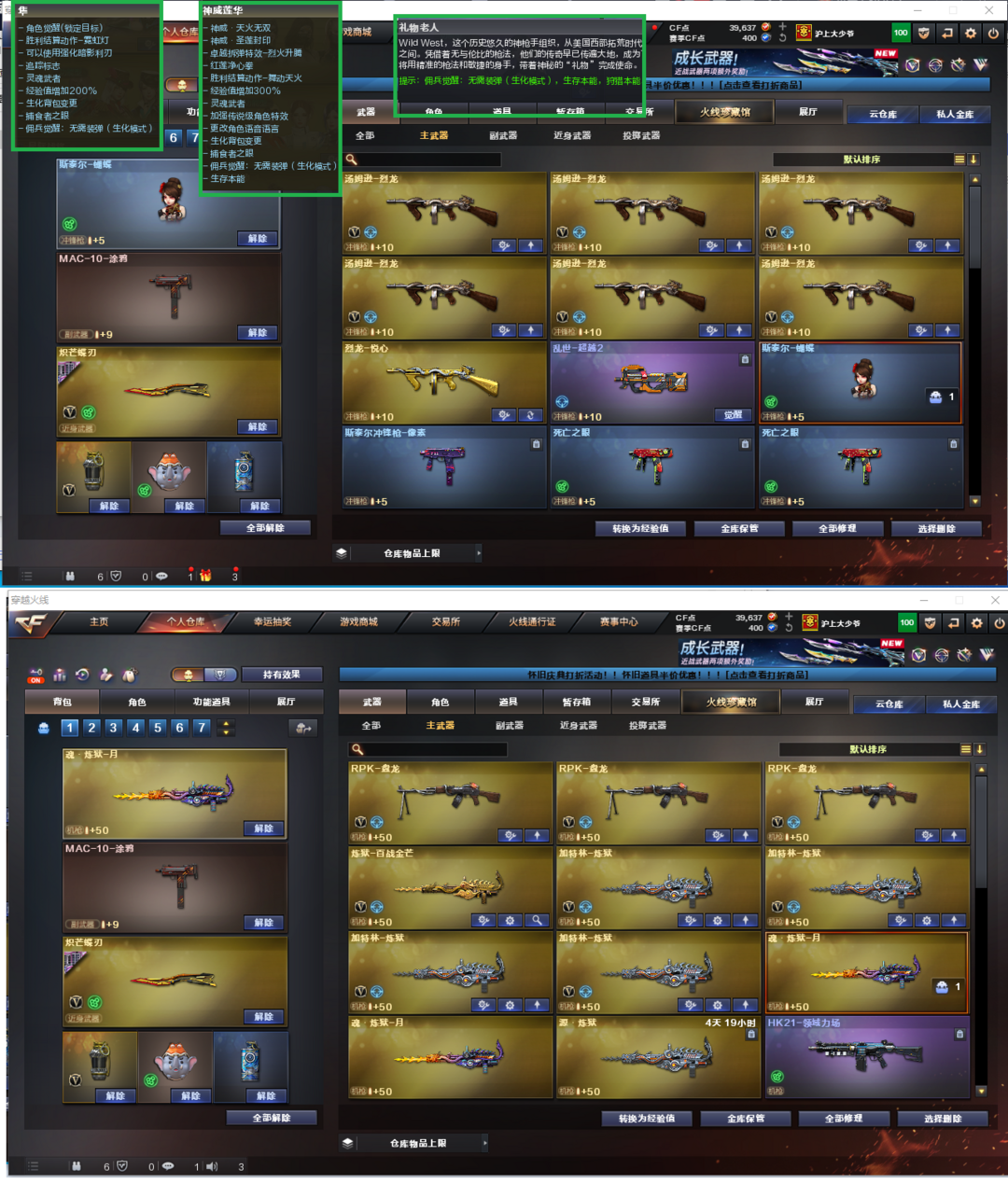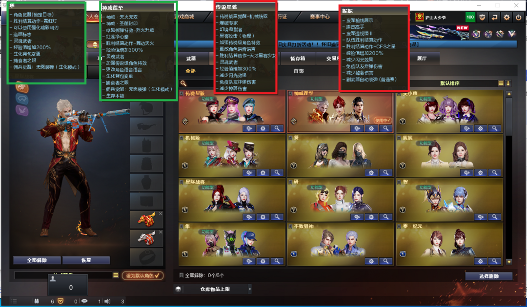 装备描述:排位:可以----------------生化四防全装(可以变更背包、查看生化僵尸血量):无需换弹、6烈3盘、5炼狱、斯太尔蝴蝶、HK21领域立场、死亡之眼、双面神、MAC-涂鸦、炽芒蝶刃、生化减速雷、超级对讲机、、、、、、、、、爆破四防:幻神10皮+音效(KZ、EP荣耀、权、星火小队、巅峰荣耀、23白鲨、丹凤、周瑜、电流骇客、动感闪耀皮肤)、王者幻神、98K星神、星神-量子之心、、、、USP冥王、COP雷霆、USP雷暴王者、23白鲨柯尔特、冠军之特、COP王者堕天神、EP荣耀柯尔特、、、、、G36幻影、加利尔天袭、天戎、传说圣谕、QBZ金色蔷薇、王者凌虎、、、幻神音效、裁决音效、幻影音效、星神音效、白虎音效、毁灭音效、、、6套神工天巧、1套玄豹、1套量子之心、4套雷暴王者、1套王者之魄、、、生化四防(神威莲华、隼、礼物老人)、爆破四防(传说星骇、妮妮、关小雨、机械姬、星际战将、研、智)