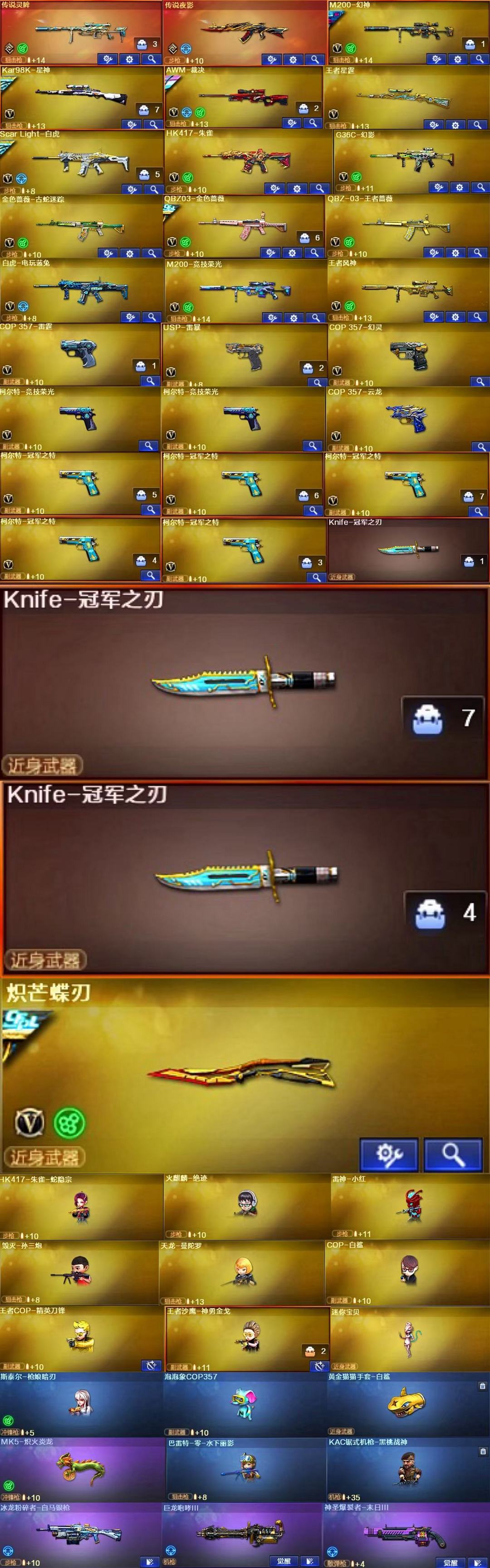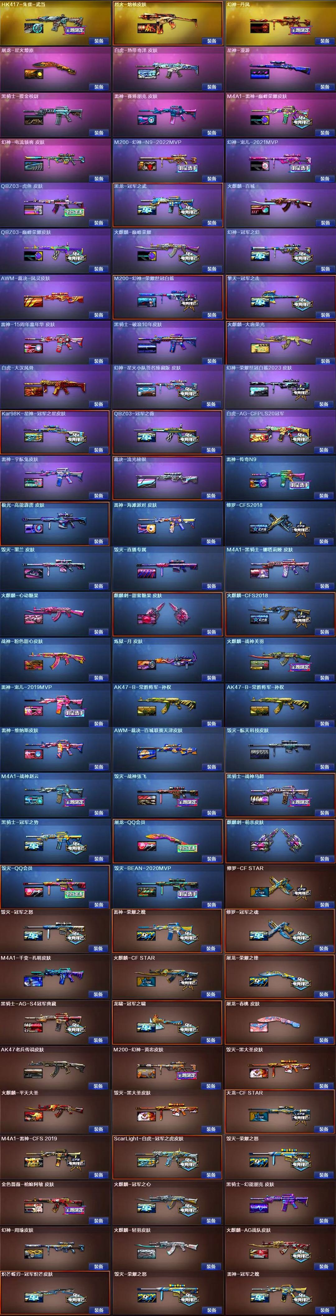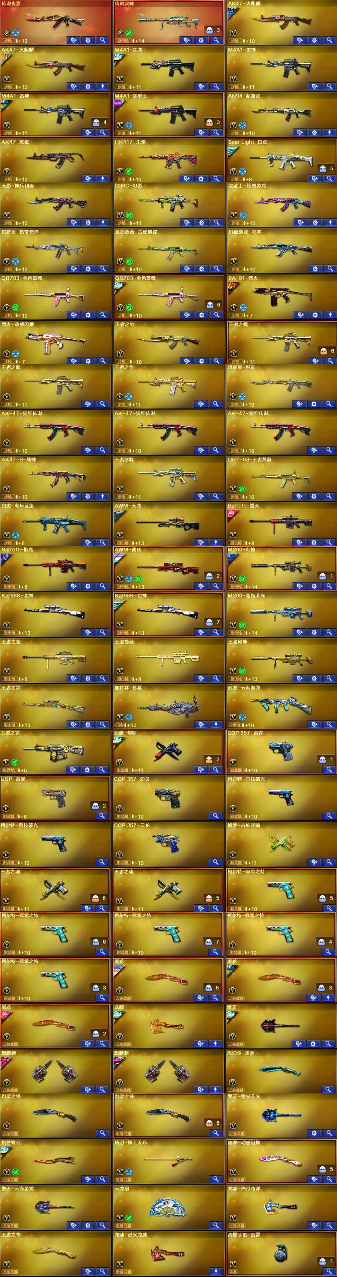 装备描述:王者武器:闪光弹-雷霆王者-觉醒版;烟雾弹-雷霆王者-觉醒版;高爆手雷-雷霆王者;王者星霆;炫金无影;王者之魄-觉醒版;王者之怒-觉醒版;王者蔷薇-觉醒版;王者沙鹰-神勇金戈;王者COP-精英刀锋;王者之势-觉醒版;王者之霆;王者之锋-觉醒版;王者冰魄-觉醒版;王者之魄烟雾弹;王者之魄闪光弹;王者之魄高爆手雷;王者之魂-觉醒版;炫金骑士;王者之心-觉醒版;炫金火麒麟;炫金修罗;QBZ-03-王者蔷薇-觉醒版;超新星-悦享-觉醒版 英雄武器:AWM-裁决;AK47-黑鲨;屠龙;Kar98K-星神;闪光弹-雷暴;闪光弹-云龙;烟雾弹-云龙;高爆手雷-云龙;云龙扇;COP 357-云龙;烟雾弹-雷霆;雷霆之契;高爆手雷-雷霆;闪光弹-雷霆;雷霆之锋;泡泡象COP357;黑武士-锦绣游龙;超新星-热带奇洋;龙啸-热带奇洋;手雷-热带奇洋;柯尔特-冠军之特;G36C-幻影;麒麟刺;加特林-炼狱;龙啸;传说灵眸;擎天;手雷-云海游龙;烈龙-云海游龙;擎天-云海游龙;幻灵之锋;闪光弹-幻灵;烟雾弹-幻灵;高爆手雷-幻灵;COP 357-幻灵;AK47-黑鲨;龙啸-烈火龙威;M4A1-雷神;手雷-动感