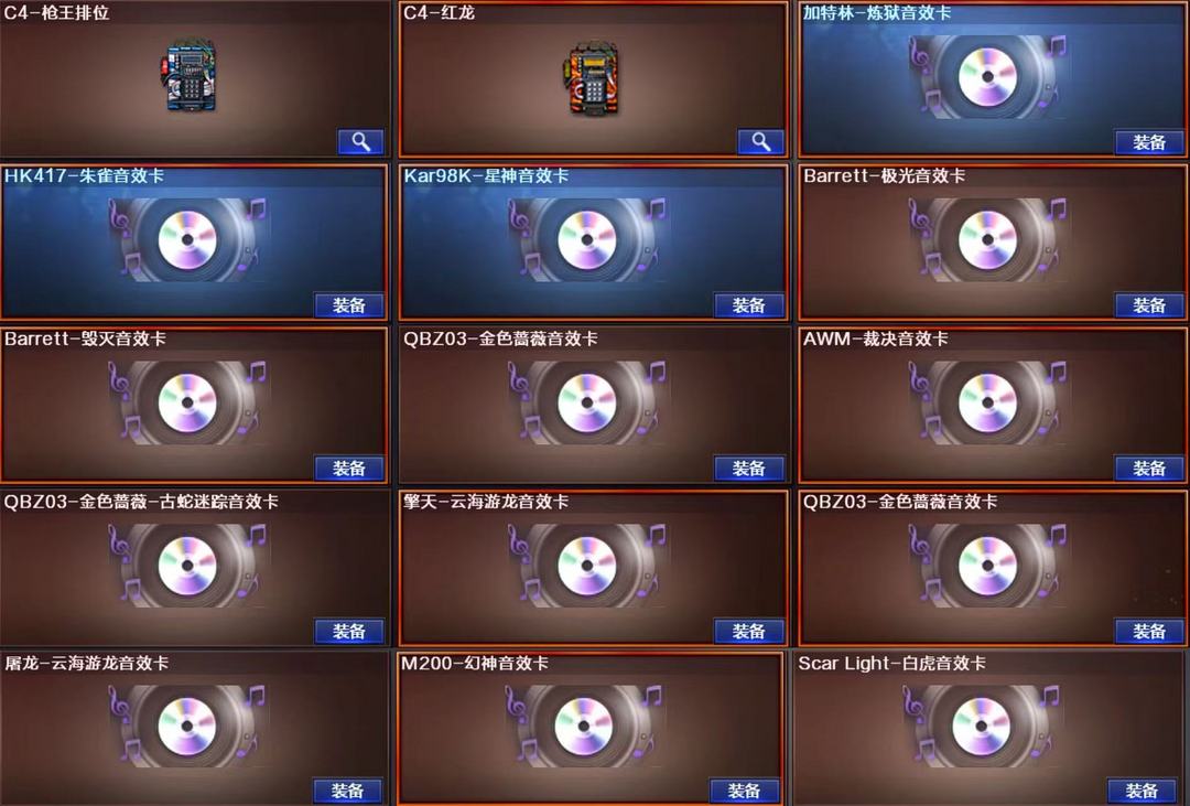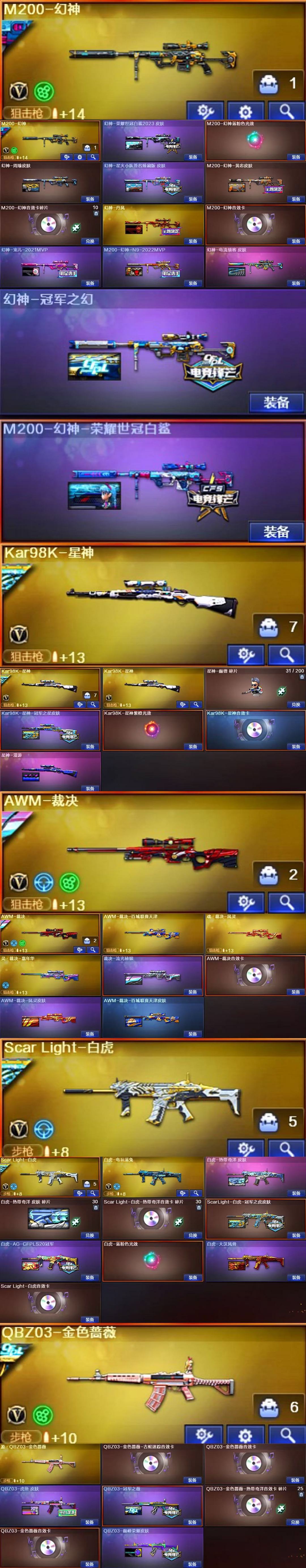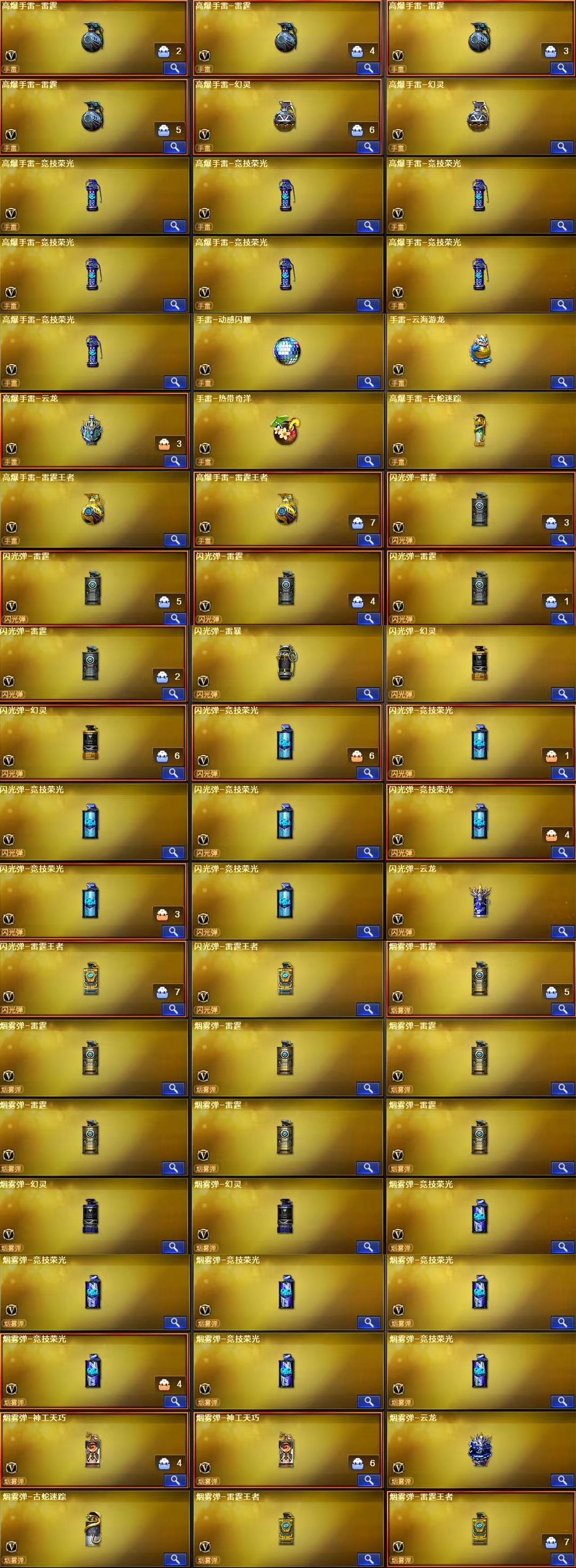 装备描述:王者武器:闪光弹-雷霆王者-觉醒版;烟雾弹-雷霆王者-觉醒版;高爆手雷-雷霆王者;王者星霆;炫金无影;王者之魄-觉醒版;王者之怒-觉醒版;王者蔷薇-觉醒版;王者沙鹰-神勇金戈;王者COP-精英刀锋;王者之势-觉醒版;王者之霆;王者之锋-觉醒版;王者冰魄-觉醒版;王者之魄烟雾弹;王者之魄闪光弹;王者之魄高爆手雷;王者之魂-觉醒版;炫金骑士;王者之心-觉醒版;炫金火麒麟;炫金修罗;QBZ-03-王者蔷薇-觉醒版;超新星-悦享-觉醒版 英雄武器:AWM-裁决;AK47-黑鲨;屠龙;Kar98K-星神;闪光弹-雷暴;闪光弹-云龙;烟雾弹-云龙;高爆手雷-云龙;云龙扇;COP 357-云龙;烟雾弹-雷霆;雷霆之契;高爆手雷-雷霆;闪光弹-雷霆;雷霆之锋;泡泡象COP357;黑武士-锦绣游龙;超新星-热带奇洋;龙啸-热带奇洋;手雷-热带奇洋;柯尔特-冠军之特;G36C-幻影;麒麟刺;加特林-炼狱;龙啸;传说灵眸;擎天;手雷-云海游龙;烈龙-云海游龙;擎天-云海游龙;幻灵之锋;闪光弹-幻灵;烟雾弹-幻灵;高爆手雷-幻灵;COP 357-幻灵;AK47-黑鲨;龙啸-烈火龙威;M4A1-雷神;手雷-动感