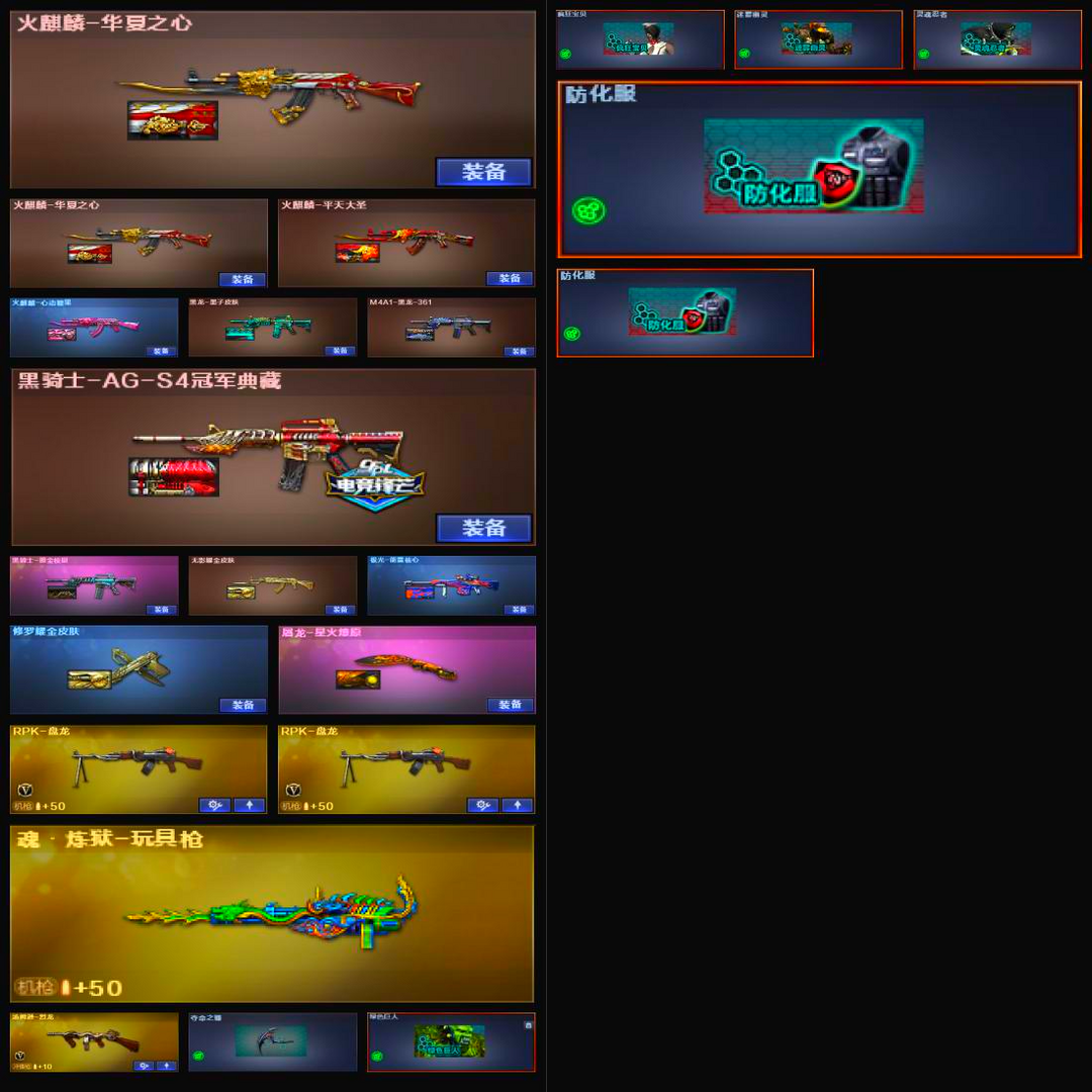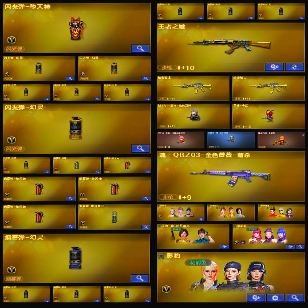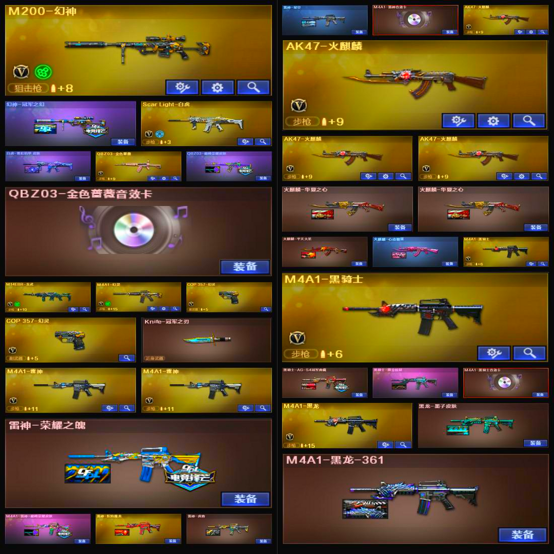 装备描述:【幻神1皮】【金色蔷薇三件套】【幻灵套装X8套】【堕天神套装X4套】【堕天神套装X4套】【雷霆套装X1套】【M200-幻神】【幻神-冠军之幻】【Scar Light-白虎】【白虎-霓虹机甲 皮肤】【QBZ03-金色蔷薇】【QBZ03-巅峰荣耀皮肤】【QBZ03-金色蔷薇音效卡】【M14EBR-玄武】【M4A1-幻灵】【COP 357-幻灵】【Knife-冠军之刃】【RPK-盘龙】【魂·炼狱-玩具枪】【汤姆逊-烈龙】【迷迭香】【奇洋探员】【乔伊教练】【王者-瞳-闭月羞花】【雾萌萌】【影豹】【魅影】【M4A1-雷神】【雷神-荣耀之魄】【M4A1-雷神-巅峰荣耀皮肤】【雷神-炽焰魔龙】【雷神-虎将】【雷神-星空】【M4A1-雷神音效卡】【AK47-火麒麟】【火麒麟-华夏之心】【火麒麟-平天大圣】【火麒麟-心动糖果】【M4A1-黑骑士】【黑骑士-AG-S4冠军典藏】【黑骑士-摸金校尉】【M4A1-黑骑士音效卡】【M4A1-黑龙】【黑龙-墨子皮肤】【M4A1-黑龙-361】【Barrett-毁灭】【毁灭耀金皮肤】【毁灭-星空】【毁灭-神秘黑洞皮肤】【Barrett-毁灭音效卡】