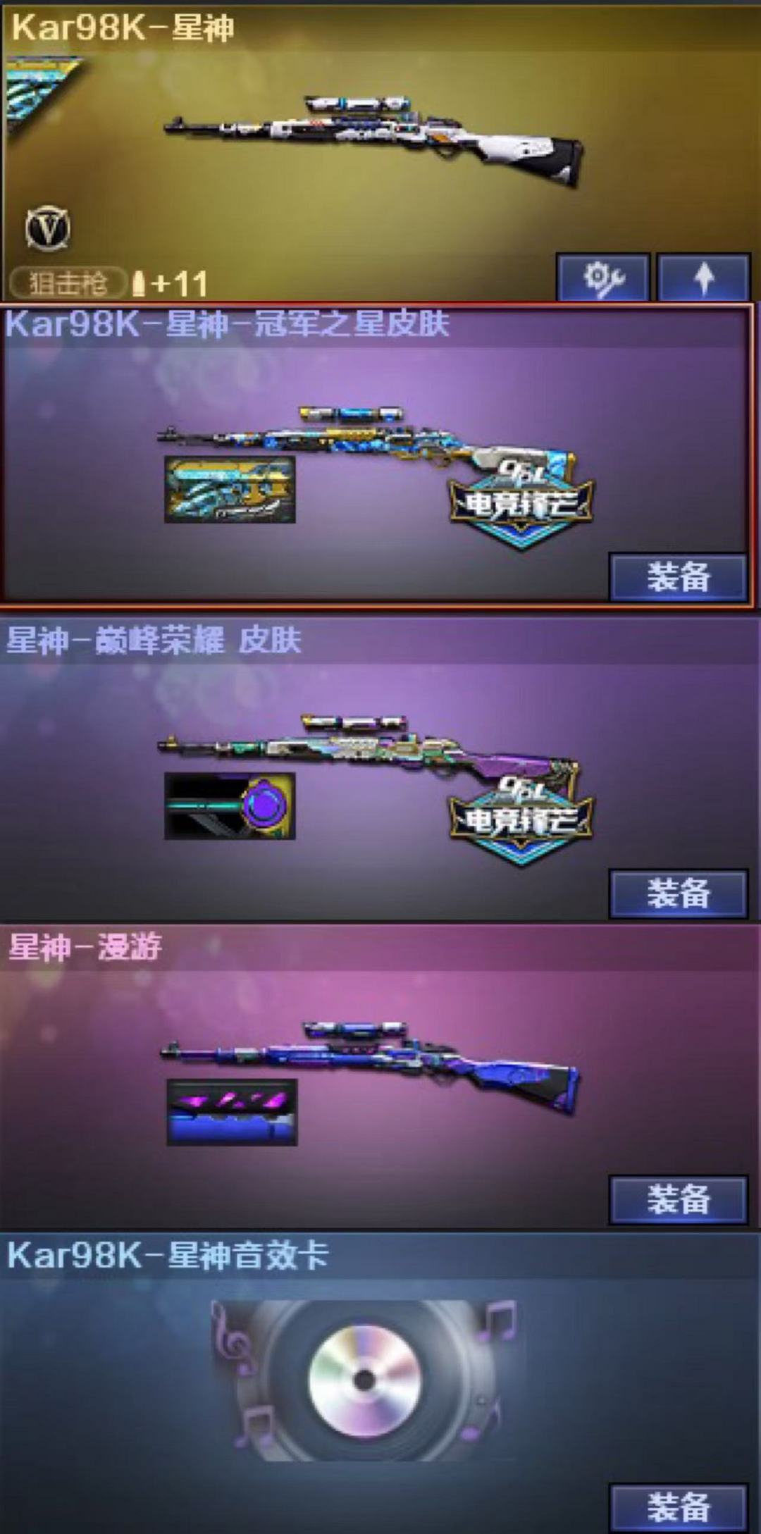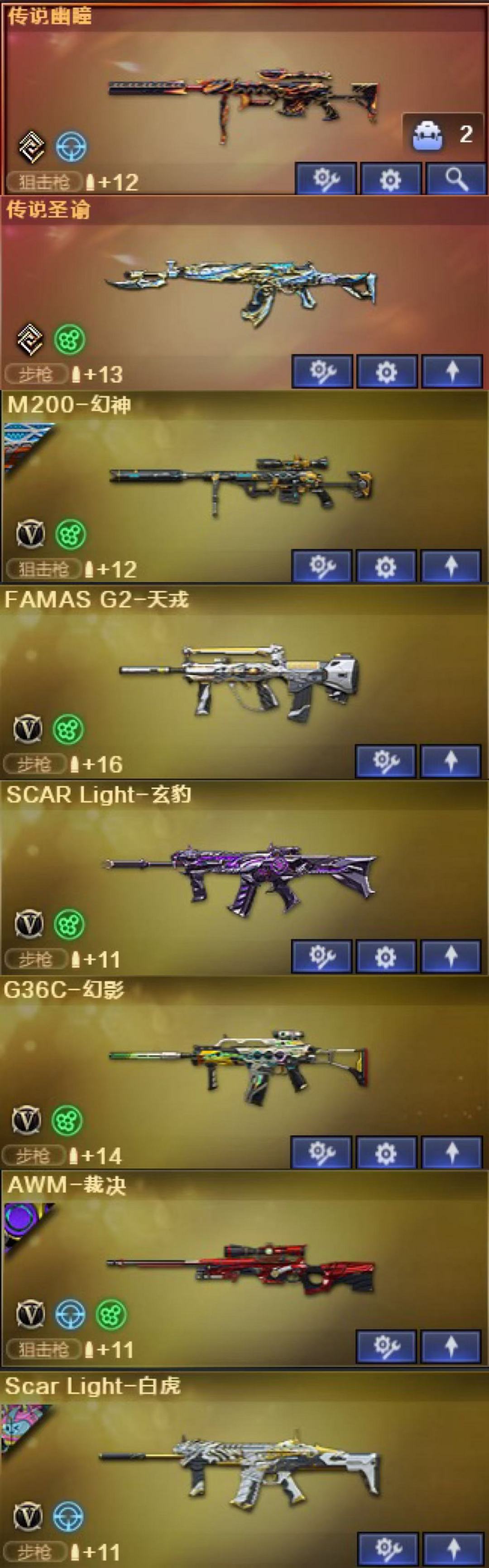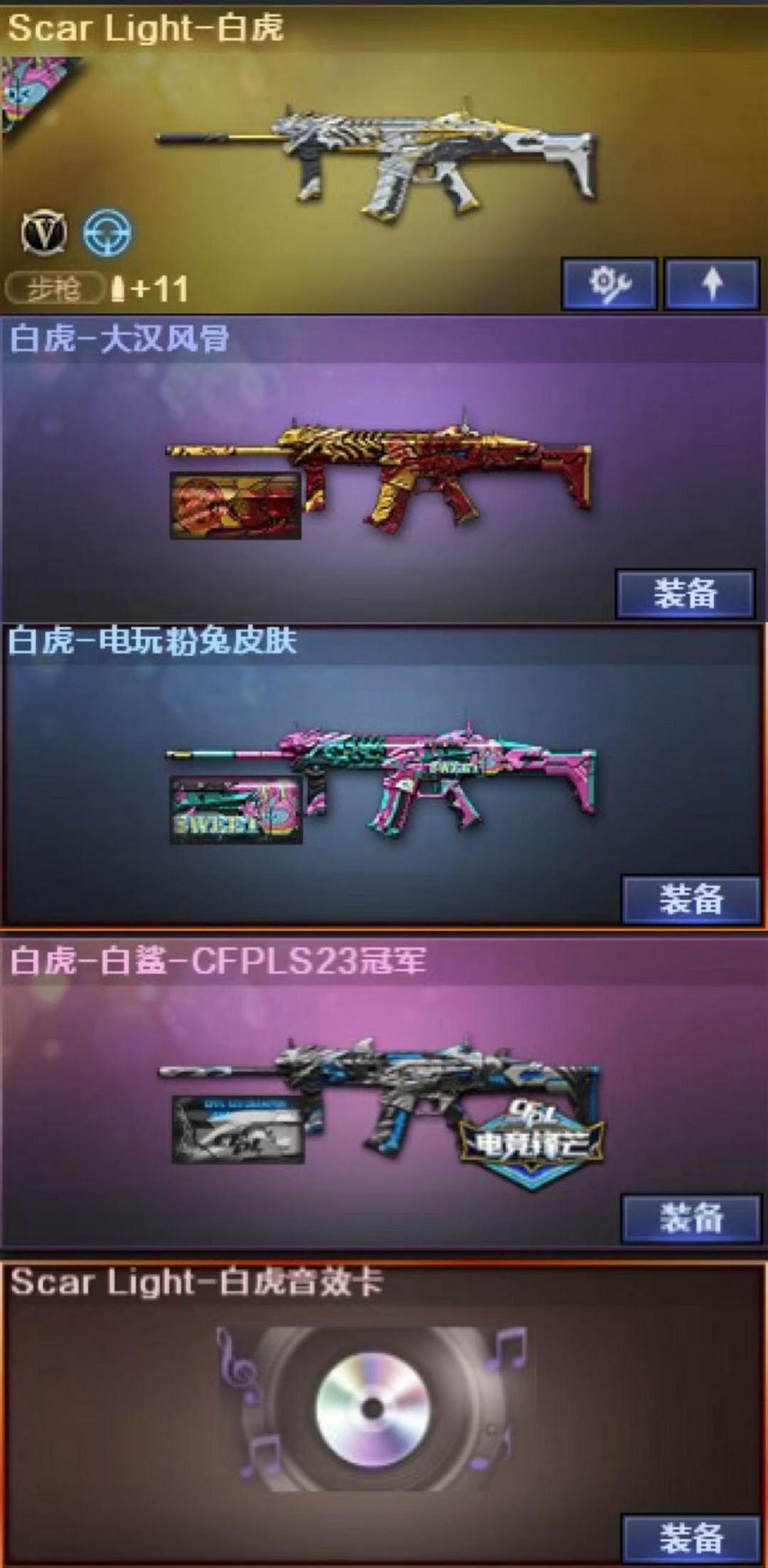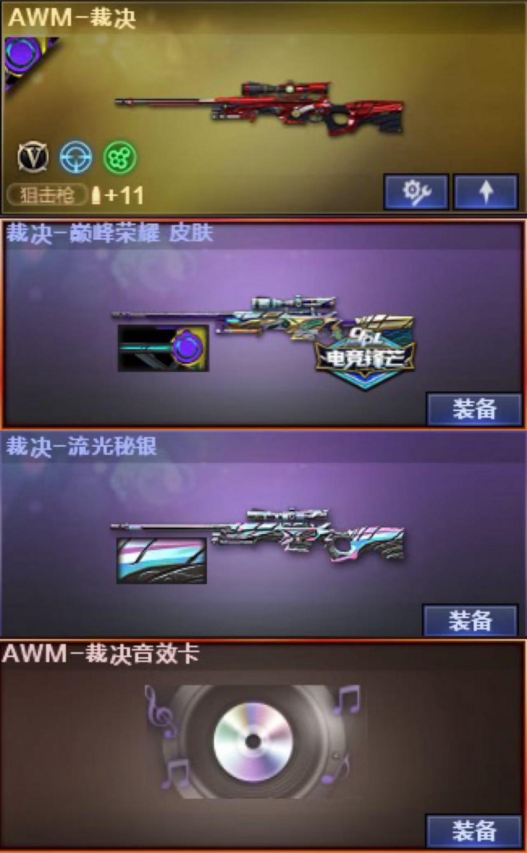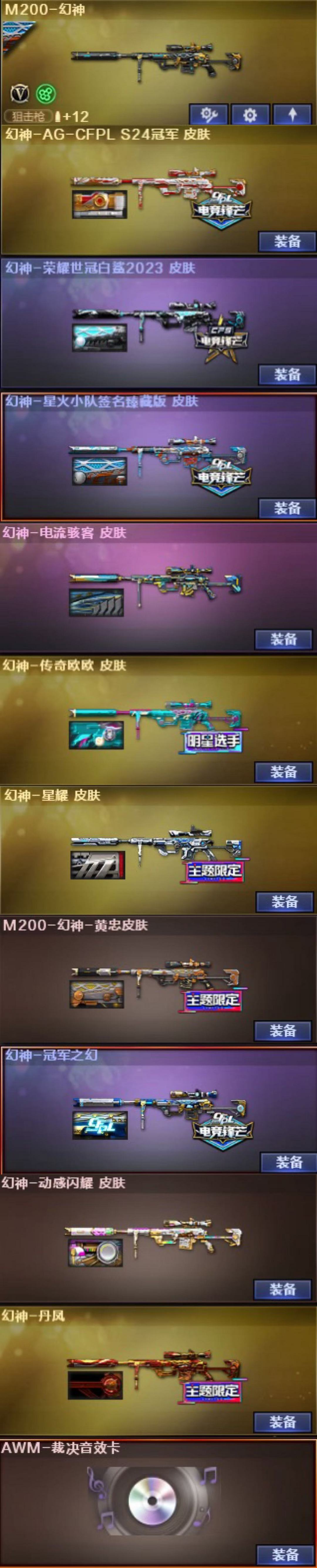 装备描述:9A91-烈火;闪光弹-玄豹;丛林匕首-玄豹;SCAR Light-玄豹;USP-冥王;烟雾弹-玄豹;Anaconda-玄豹;M4A1-黑龙;机械迷城-穹宇;传说圣谕;沙鹰-天神;FAMAS G2-天戎;QBZ03-天罚;AK47-火麒麟;M4A1-雷神;黑骑士-海王;AWM-裁决;G36C-幻影;M200-幻神;柯尔特-荣耀世冠白鲨2023;炽芒蝶刃;传说幽瞳;传说幽冥;闪光弹-竞技荣光;烟雾弹-竞技荣光;擎天-竞技荣光;高爆手雷-竞技荣光;屠龙;Barrett-暗月传说;烈火-动感闪耀;天神-动感闪耀;屠龙-动感闪耀;手雷-动感闪耀;USP-神工天巧;闪光弹-神工天巧;高爆手雷-神工天巧;烟雾弹-神工天巧;唐刀-神工天巧;M4A1-神工天巧;沙鹰-修罗;无影-神兵利器;M4A1-千变;M4A1-黑骑士;传说夜影;麒麟刺;AK47-机械迷城;Kar98K-星神;AK12-天启;AK47-黑鲨;Barrett-毁灭;柯尔特-冠军之特;Barrett-极光;汤姆逊-烈龙;白虎-电玩蓝兔;AK47-B-常胜将军;AN94-超新星;烟雾弹-电竞装甲;柯尔特-电竞装甲;传说暗裔;闪光弹-电竞装