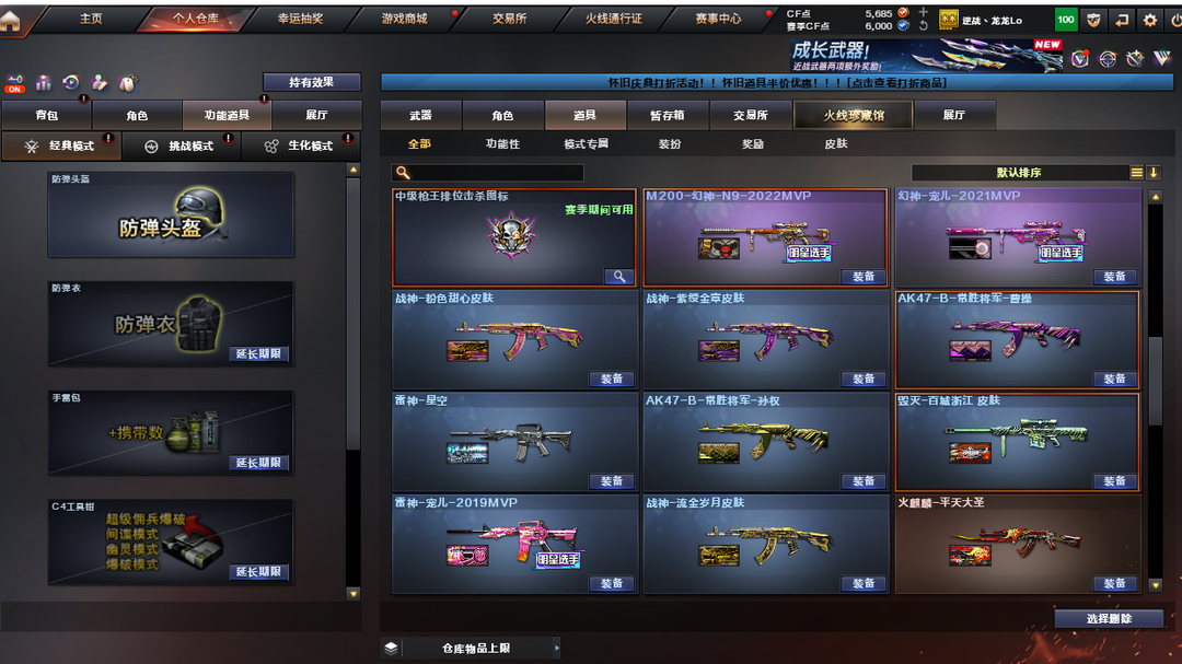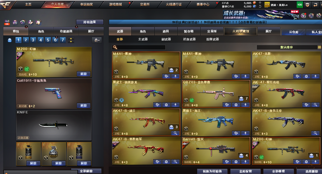 装备描述:王者武器:闪光弹-雷霆王者-觉醒版 英雄武器:M4A1-雷神;黑武士-锦绣游龙;闪光弹-幻灵;幻灵之锋;高爆手雷-幻灵;烟雾弹-幻灵;龙啸-烈火龙威;M200-幻神;Barrett-暗月传说;AK-47-猩红传说;Barrett-毁灭;AK47-B-常胜将军;AK47-B-战士;AK47-B-身先士卒;QBZ03-金色蔷薇;黑骑士-海王;屠龙;AK47-无影
