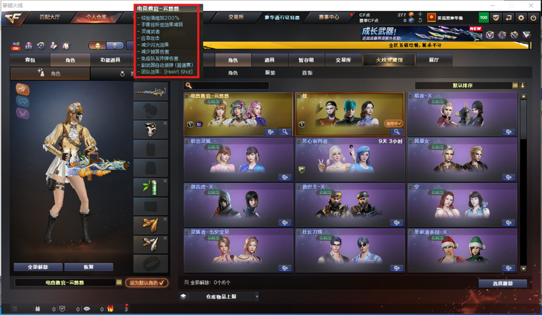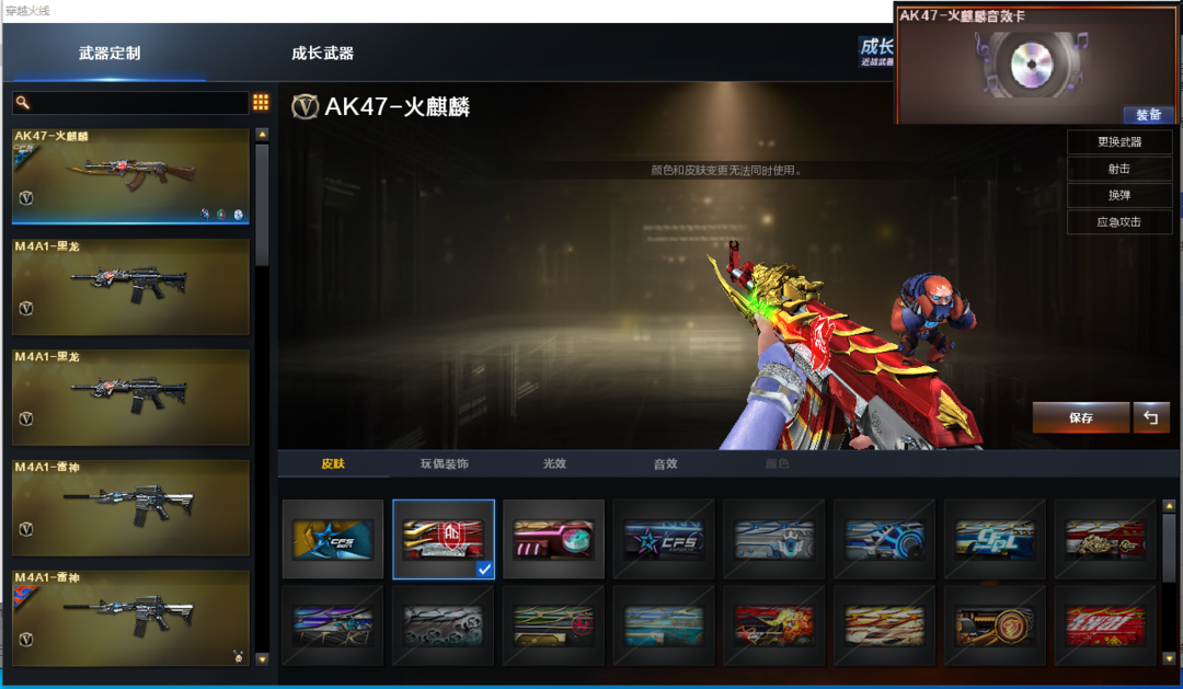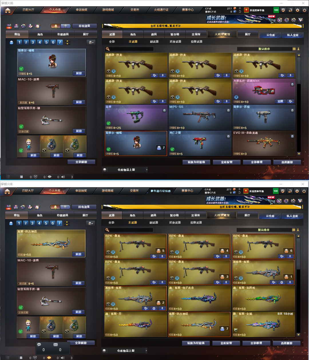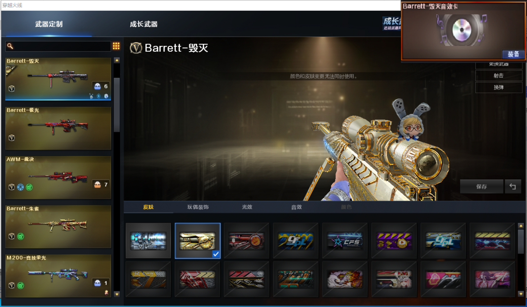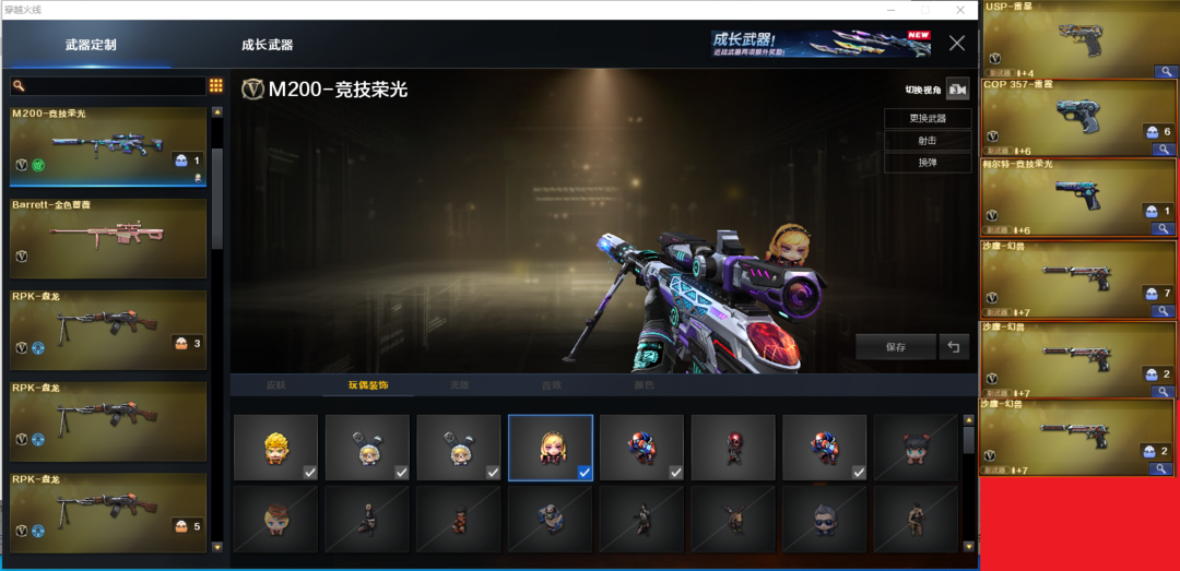 装备描述:排位:可以、、、、、、、、、、、、、爆破四防:幻神竞技荣光、、、、、USP雷暴、柯尔特竞技荣光、COP雷霆、3套幻兽沙鹰、、、、QBZ幻兽、白虎、QBZ金色蔷薇、、、毁灭音效、火麒麟音效、、、3套幻兽、6套雷霆、7套竞技荣光、、、爆破四防(云悠悠)