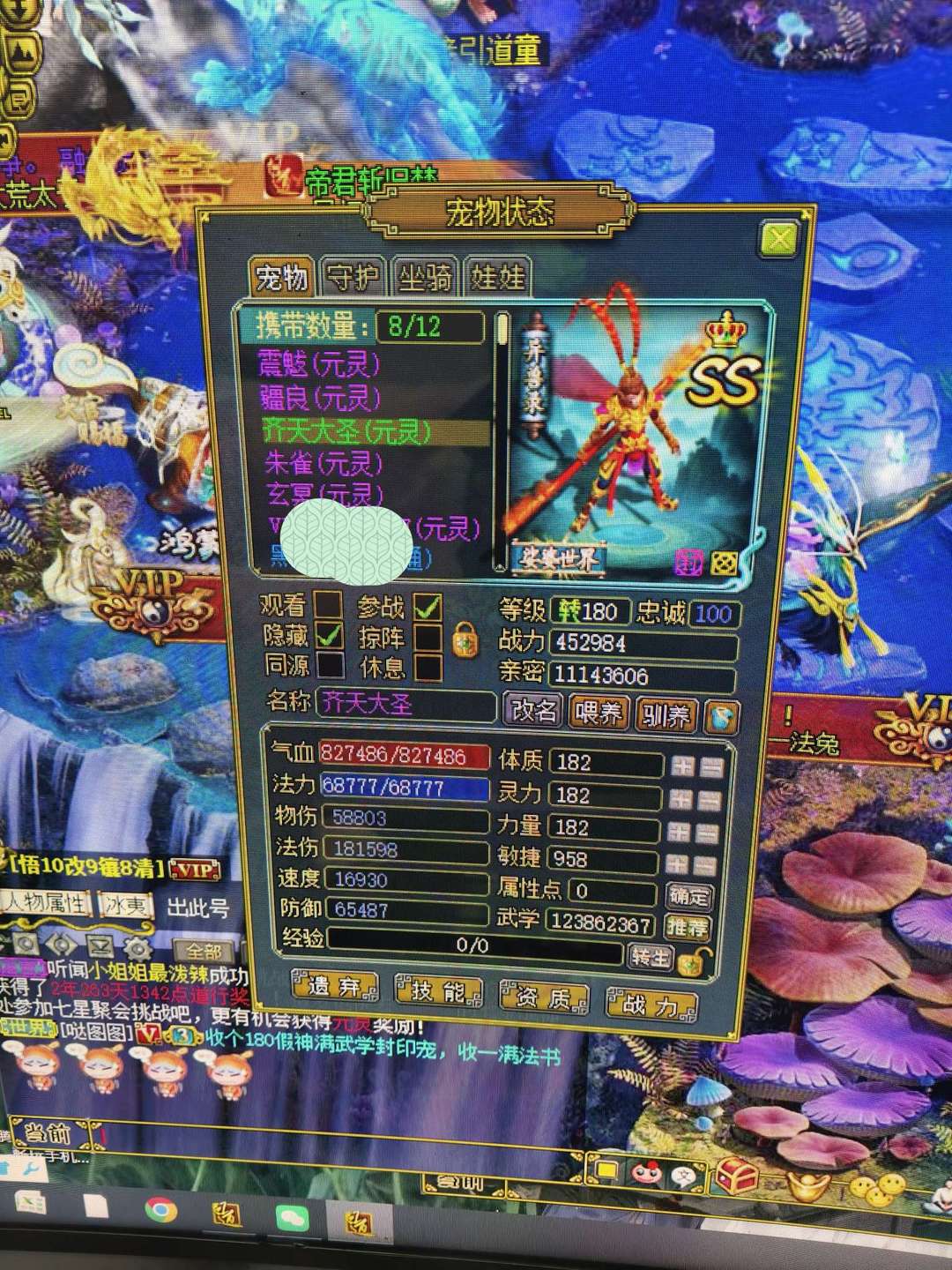 装备描述:不用下载上号器会掉线,找客服远程上号!单挑带赤天,强袭束手就擒,对面2回合不能出手,单挑神器,会玩的都懂,群战带大圣,强袭闻风丧胆,出战就控制对方控手不能出手! 上号打架,全套共鸣克火克水,输出爆炸基本一个人可以单挑一个队伍,全套改9。2个24法宝,元灵大圣镇波,翻天印,混沌钟,秒杀此区任何同出租的等级兔子孔雀,不服来战!宠物栏名字看!可日租月租!