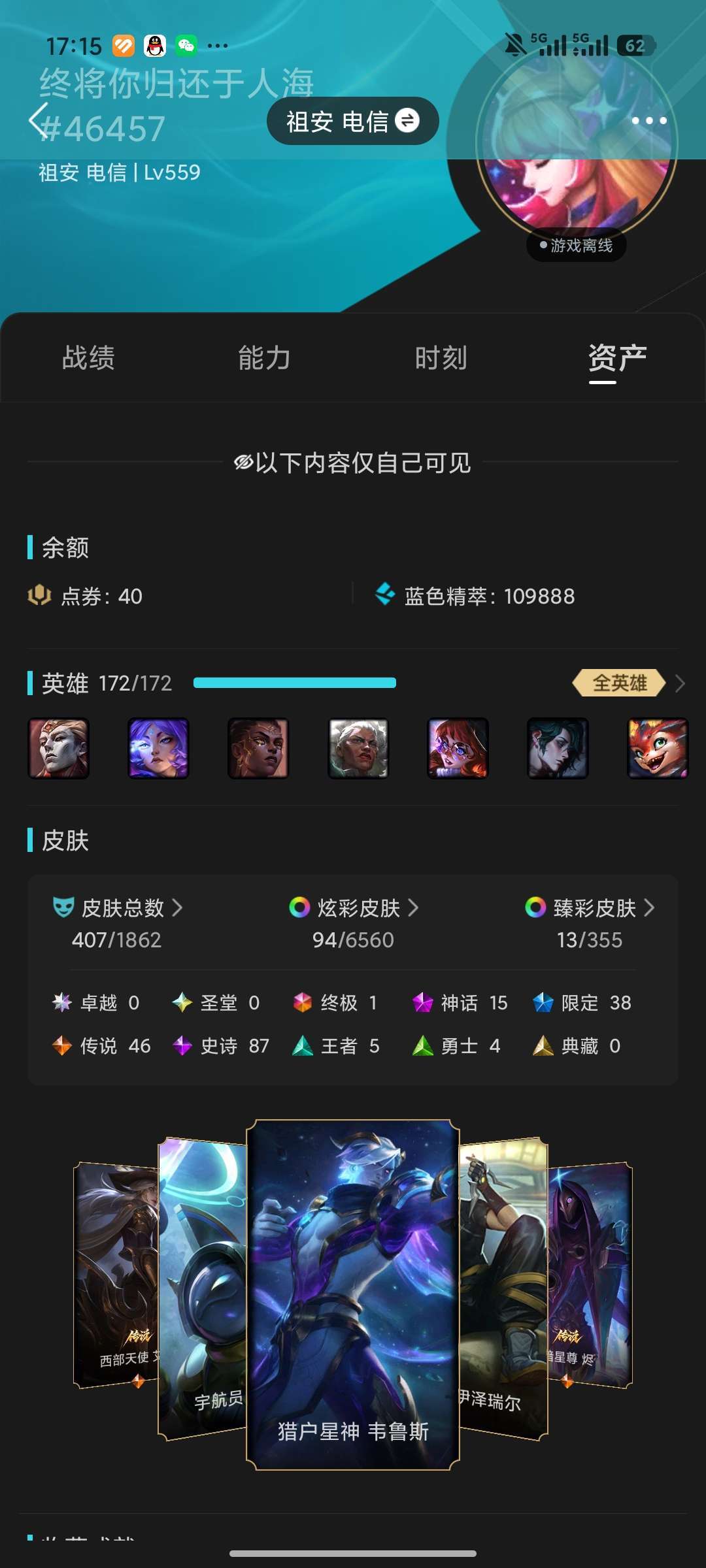 300皮肤 全英雄 祖安大区 多赛季单双大师