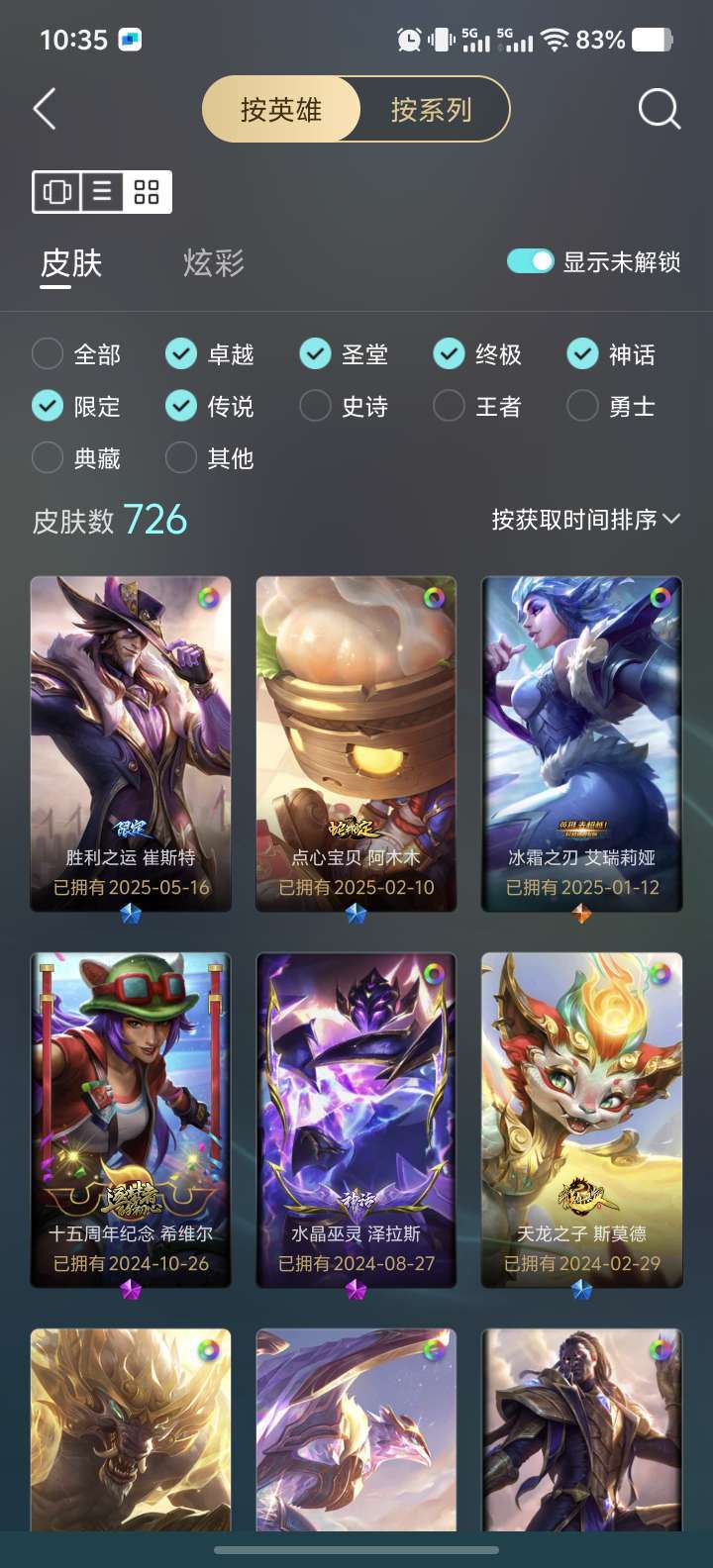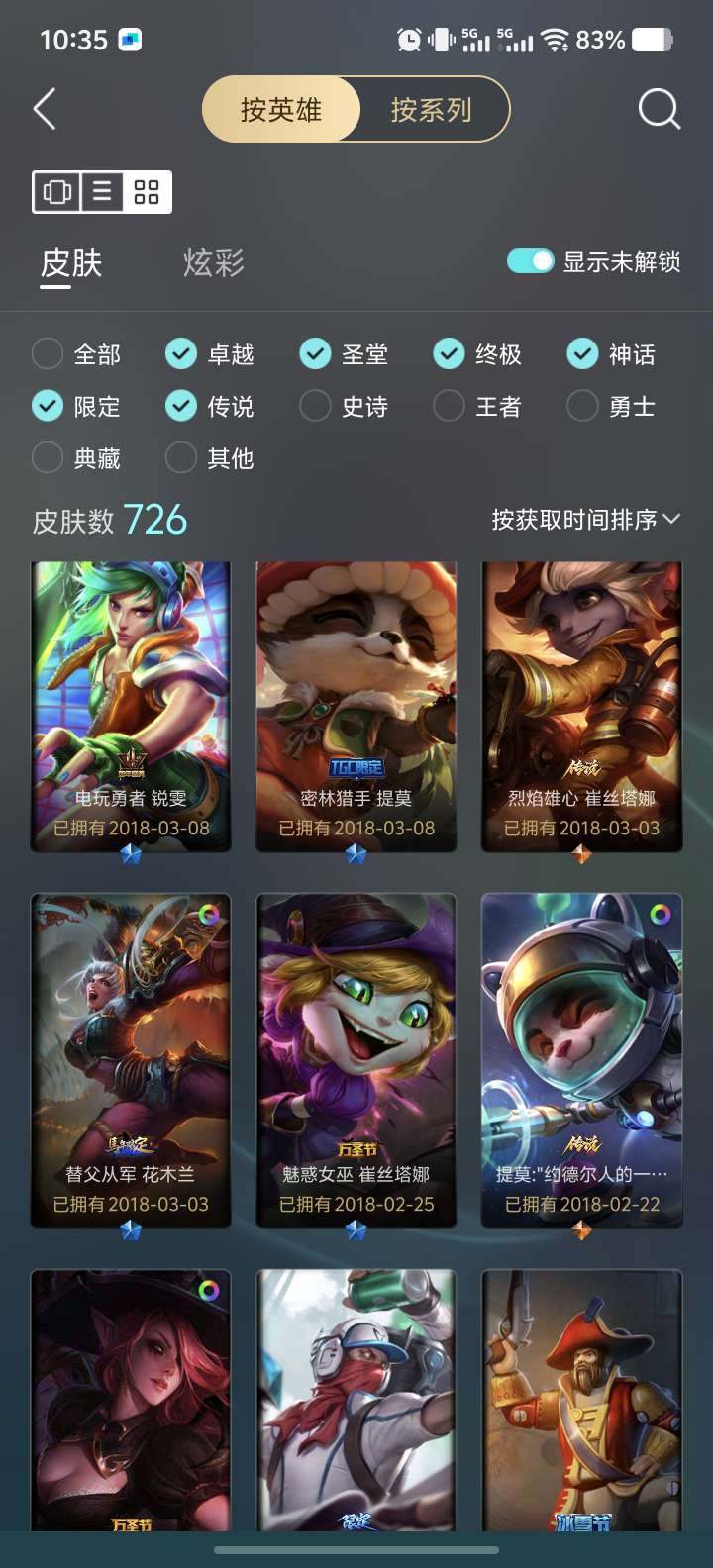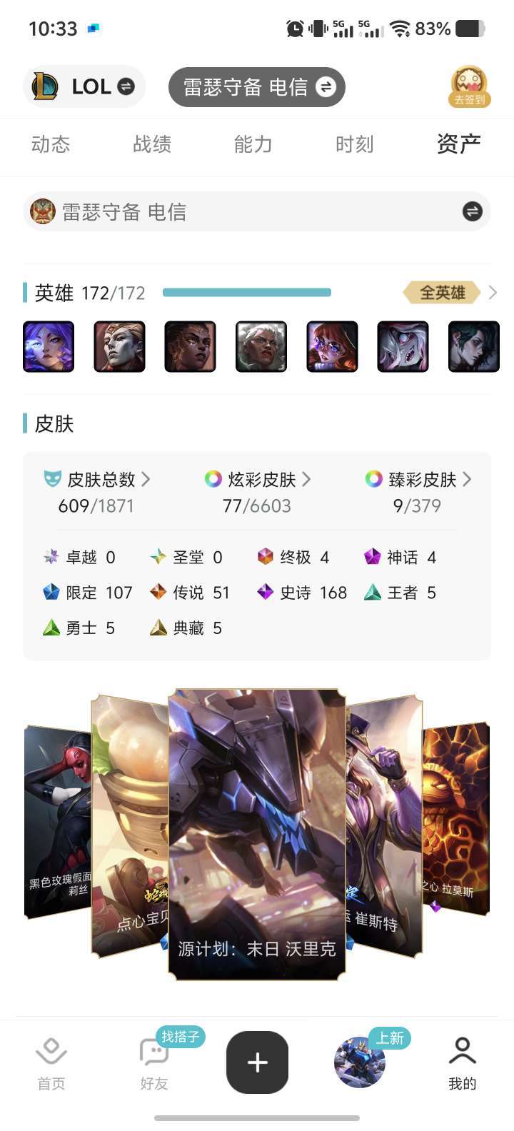 装备描述:全英雄/600多皮肤/限定/典藏/传说/冰雪节/skt/未来战士系列等等