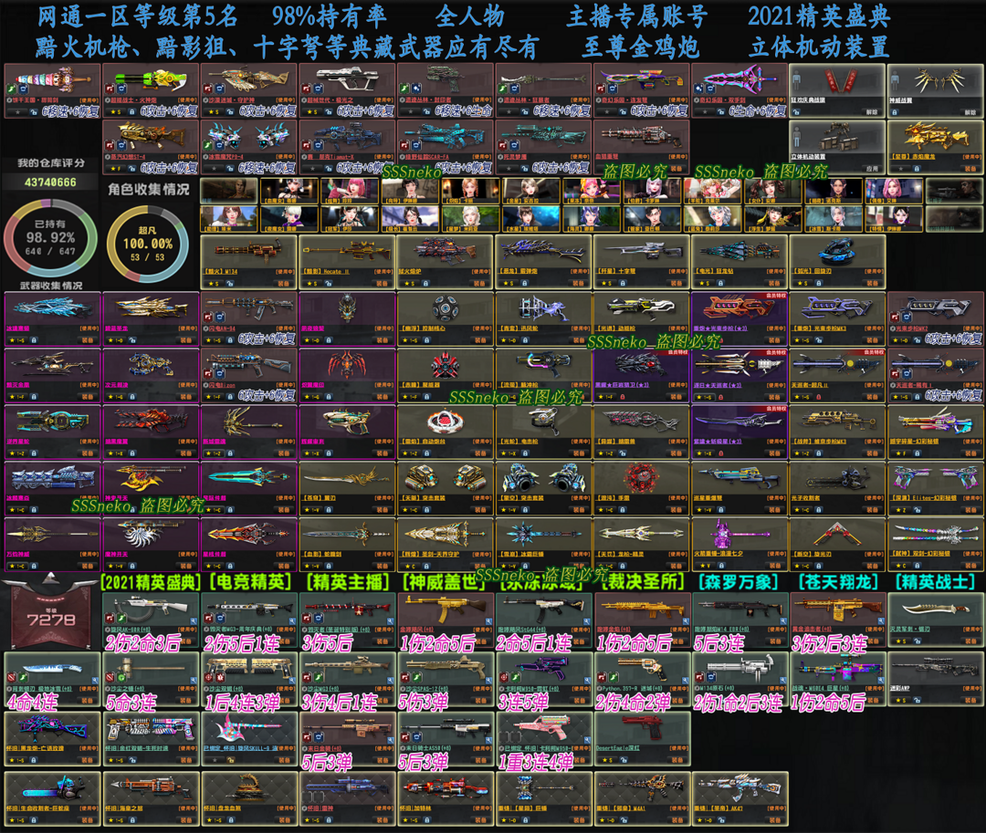 限制: 租号5次及以上 |装备描述:【请勿使用账号芯片,一经发现,全一一家一一户一一籍一一人一一肉一一搜一一索一一警一一告】 【有建议请您⑤星好评+留言,谢谢】 ★新浅绿色称号3500荣誉,98%武器持有[2021精英盛典][精英主播],网通一区等级第5名7400级,皇家紫钻! ★绝版装饰:战旗、立体机动装置! ★特典武器:黯火机枪+黯影狙+狱火熔炉+歼星十字弩等。至尊金鸡炮。 ★全部武器全6攻6恢复,请您去仓库里自行切换!大灾变满插件! 【玩过别忘收藏!!!用心打造极品账号,给您最棒的游戏体验!】