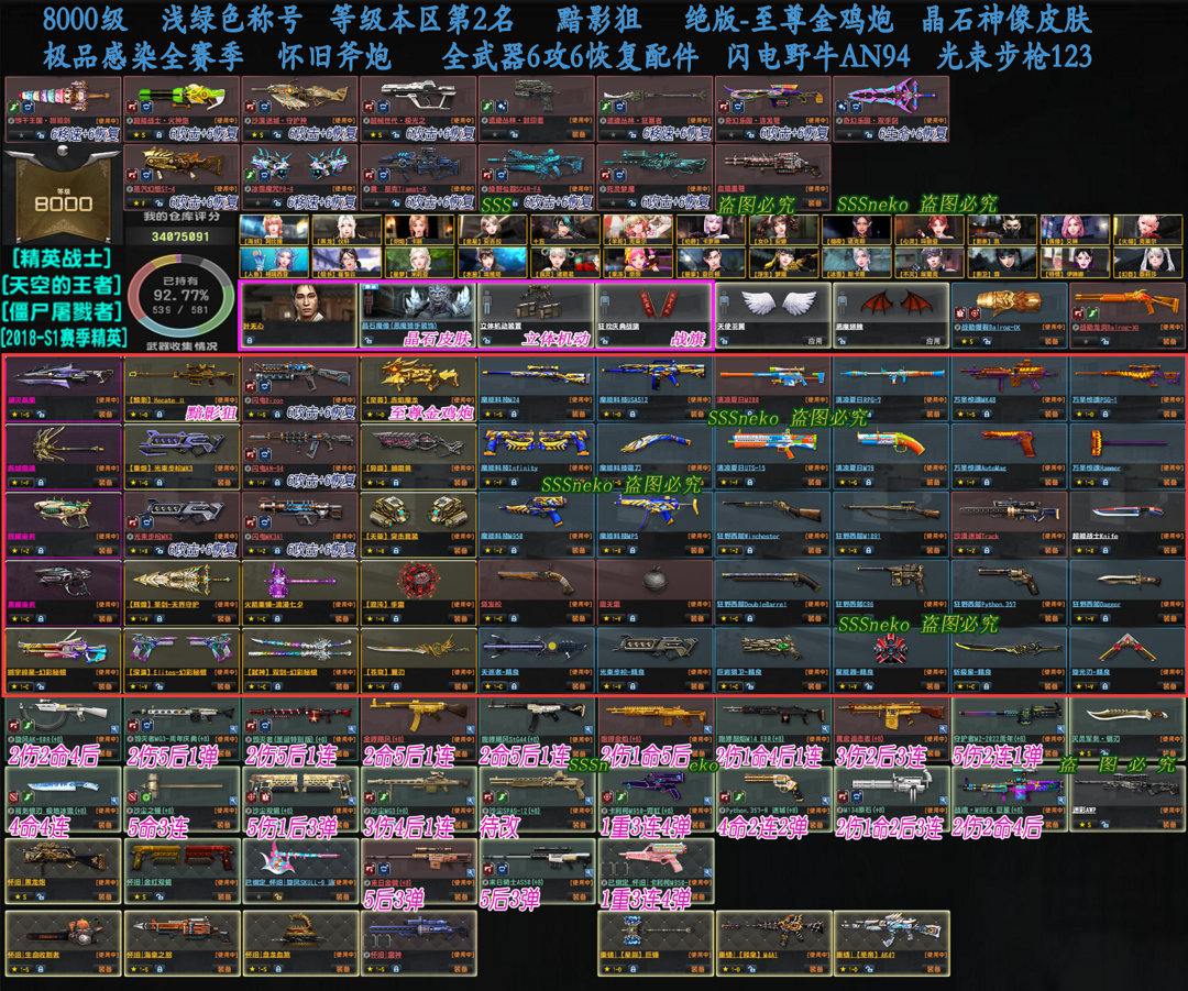 限制: 租号7次及以上 |装备描述:【请勿使用账号芯片,一经发现,全一一家一一户一一籍一一警一一告】 【有建议请您⑤星好评+留言,谢谢】 ★浅绿色称号94%武器持有[2018-S1赛季精英][精英战士]!电信二区等级第2名8000级! ★绝版装饰:战旗、立体机动装置、晶石神像-恶魔猎手皮肤! ★特典武器:黯影狙。至尊金鸡炮。 ★全部武器全6攻6恢复,请您去仓库里自行切换! 【玩过别忘收藏!!!用心打造极品账号,给您最棒的游戏体验!】