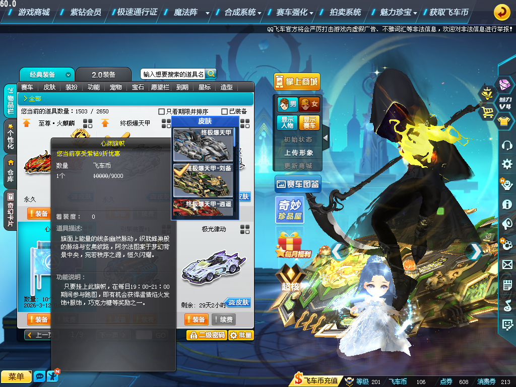 装备描述:至尊玉麒麟+29逍遥刘备+爆天甲奥丁+赵云 男女衣柜+10雪凝