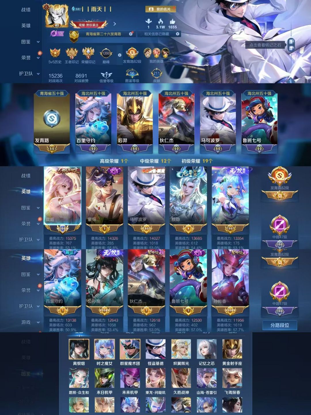 限制: 租号3次及以上 |装备描述:发育路82段14个万战1.5国服虞姬14金标1.4马可蒙犽1.3敖隐守约小乔1.2阿离狄仁杰鲁班万战孙尚香元芳戈雅伽罗刘禅巅峰击败特效3无双离恨烟魔女群星魔术团基德九州拓璇玑雪豹等等