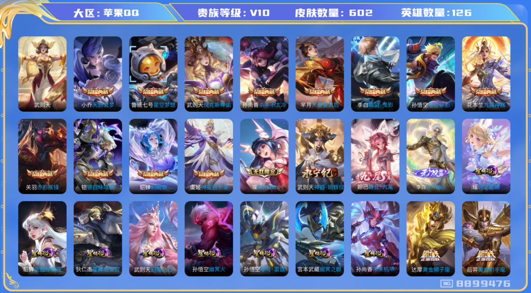 装备描述:极品v10女号 小国大乔(15020) 万战蔡文姬 万战孙膑 万战明世隐 万战瑶 53段游走 大乔全皮 可认证 苹果(q)区 606皮 13典藏 4无双 98传说 261限定 26王者印记 8星 道具内容:4天幕 32按键 74亲密玫瑰 25浓情玫瑰 实名: 可修改 贵族等级: V10 英雄数: 125 皮肤数: 597 荣耀水晶: 武则天,天鹅之梦,星空梦想,倪克斯神谕,杀手不太冷,大秦宣太后,鸣剑·曳影,全息碎影,九霄神辉,赤影疾锋,银白咏叹调,幻阙歌,神鉴启示录 无双皮: 真我赫兹(瑶),神器·明辉仪,青丘·九尾,碎月剑心 星传说: 时之愿境,幻海之心,未来机甲,幽冥之眼,零号·雷霆,幽冥火,金色仲夏夜,星际治安官 传说皮: 黄金狮子座,黄金射手座,冠军飞将,云鹰飞将,绛天战甲,黄金白羊座,猫影幻舞,久胜战神,炽阳神光,一念神魔,云霓雀翎,末日机甲-孙尚香,地狱火,仲夏夜之梦,音你心动-小乔,零号·赤焰,海洋之心,地狱之眼,飞鸢探春,音你心动-周瑜,胖达荣荣,李逍遥,乞巧织情,时之恋人-刘备,游龙清影,淬星耀世,超时空战士-狄仁杰,遇见胡旋,末日机甲-孙策,花朝如约,挚爱之约,挚