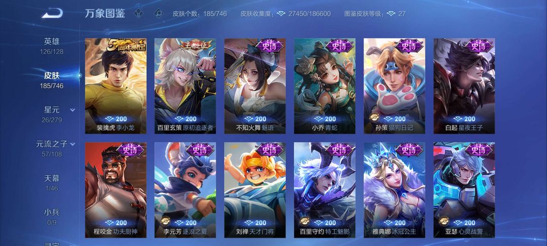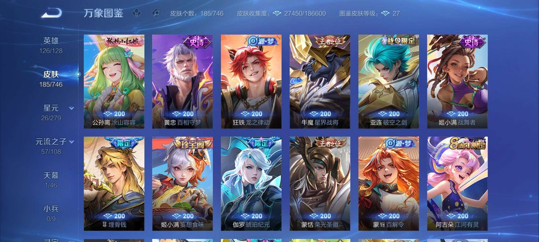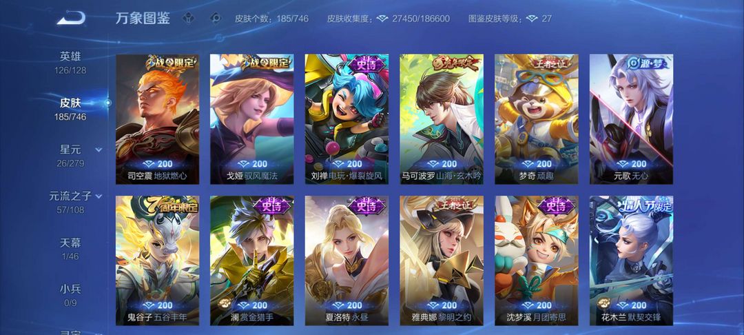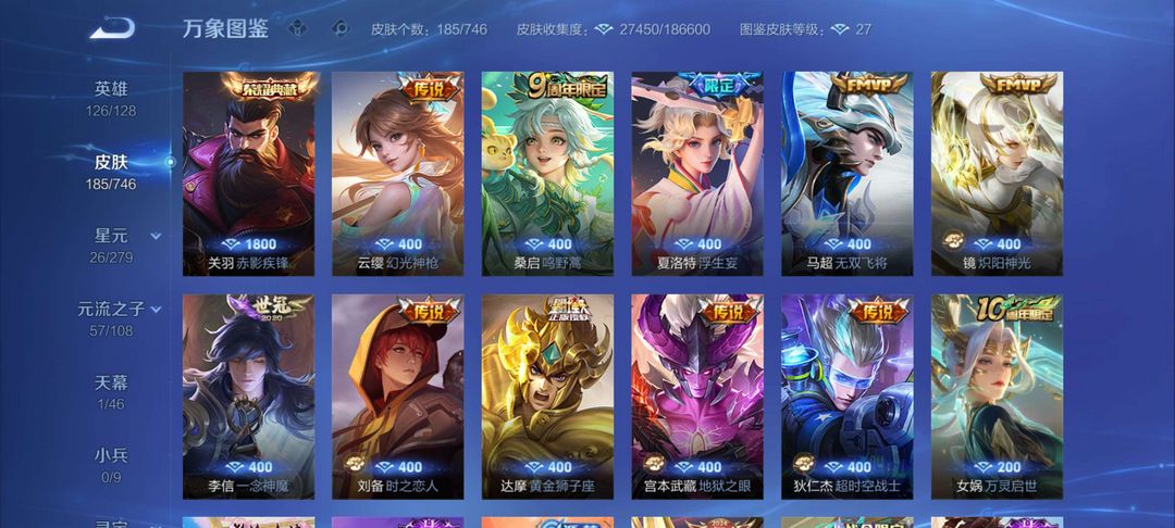 装备描述:126英雄,185皮肤,有一个典藏,两FMVP,四传说,二十四限定还有许多史诗皮等等