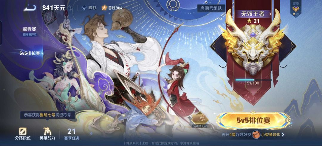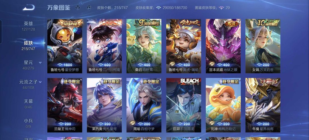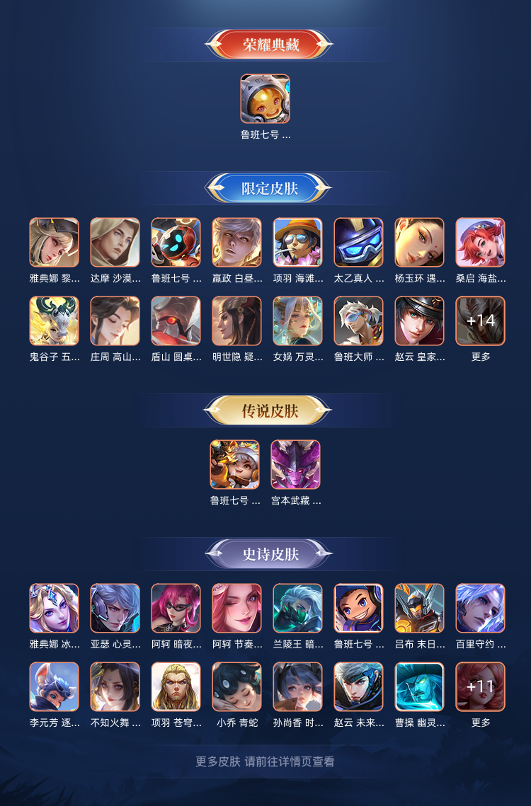 限制: 租号20次及以上 |装备描述:鲁班差一个奇之妙旅全皮肤,七千场排位鲁班战绩可发,宫本传说紫晶币皮肤 不知火服魅语等等