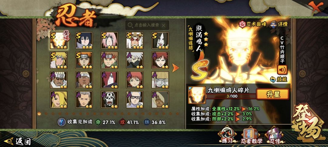 装备描述:7S 13A还有 有九喇嘛鸣人 有万花筒佐助 忍战樱等等