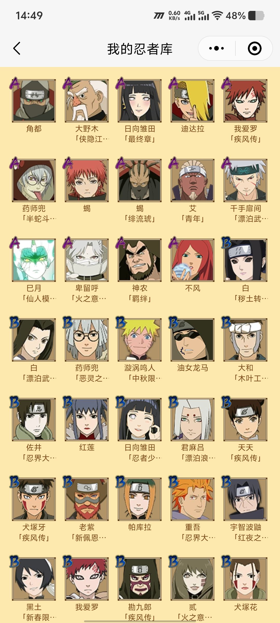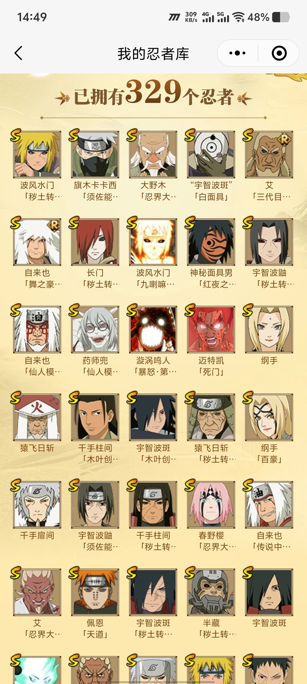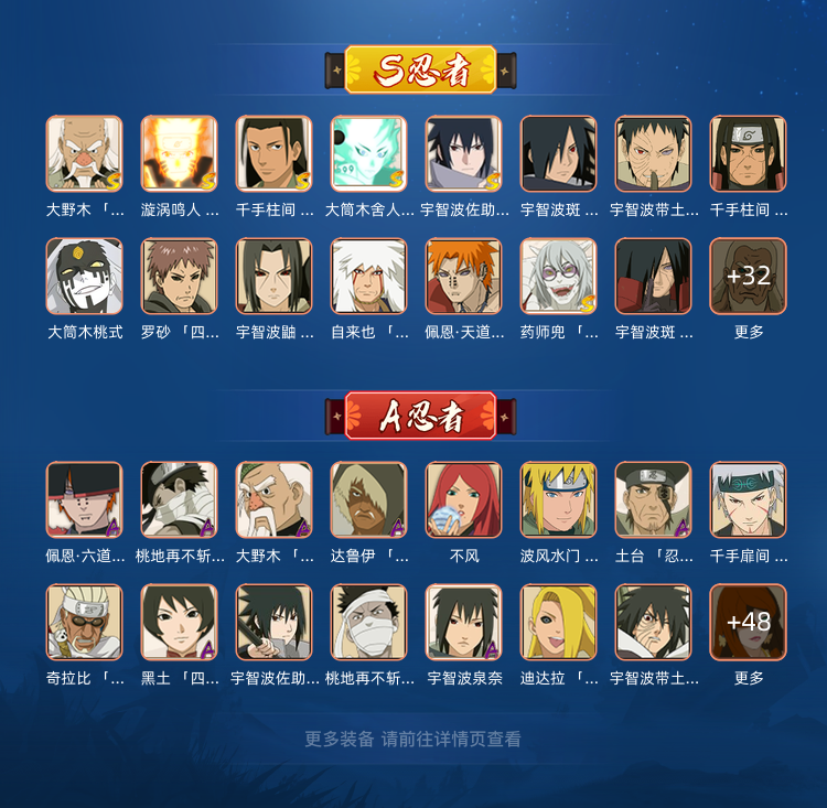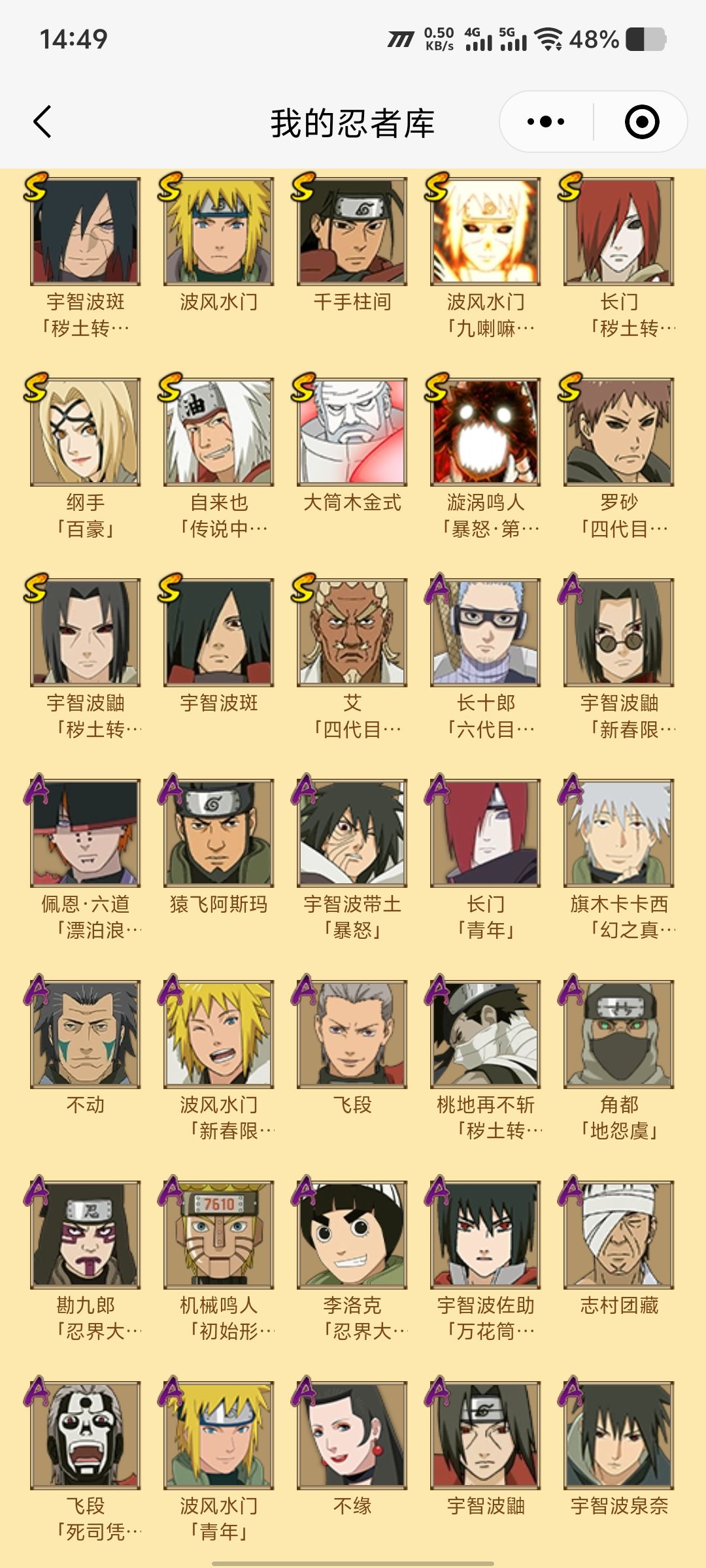48S两千四万战力=仙人巳月九喇嘛水门须佐卡卡西止水蛇人=秽土解斑永恒佐助忍战樱暴怒带土=全点券高招