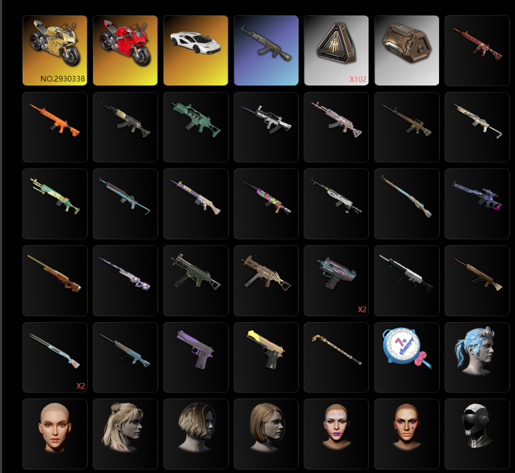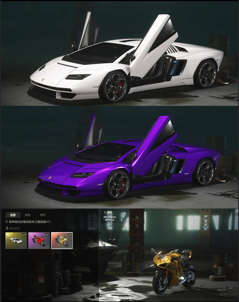 装备描述:兰博基尼究极跑车紫色车漆✌金红双杜卡迪✌黑鬼【二成长型✌4级魔咒之力MK12-权志龙AUG】✌毛绒卫衣套装蓝色+黑色✌绷带AKM✌蟒蛇M416✌成就M762✌分形QBZ✌猛虎SLR✌南瓜锅✌科技猫AUG