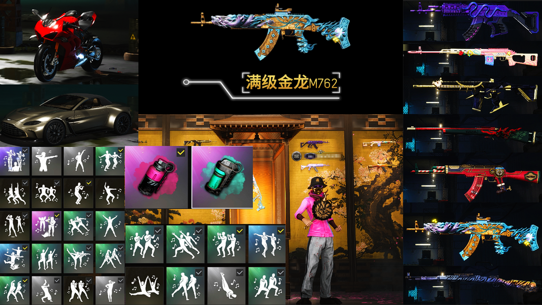 装备描述:---家里不要租 家里电脑玩不了--- 【7神器】阿斯顿马丁✨杜卡迪✨满级金龙M762✨美杜莎M762✨圣诞AKM✨孙悟空M24✨猪八戒M416✨时空使者M416✨粉梦德拉贡✨金色成就98K✨2彩色烟雾弹✨拉风龙全套✨悲喜柏林全套✨滑雪镜✨双马尾✨老黑鬼/大金牙/滑雪镜