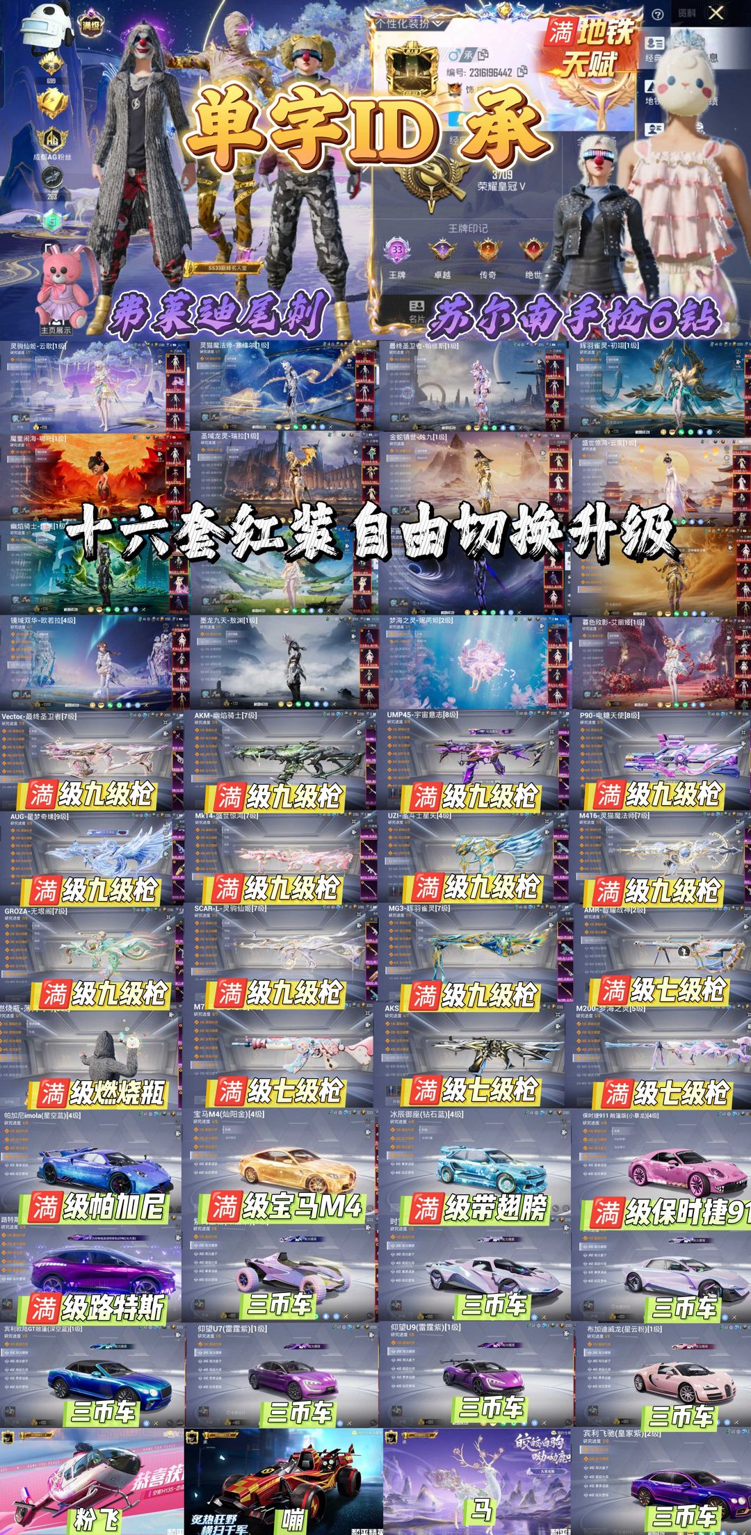 苏尔拿手枪/弗拉迪/单字ID承/满级红驭风/云歌/名人堂头像框//保时捷/宝马/帕加尼/星梦奇缘