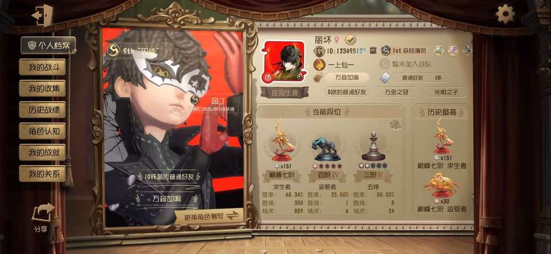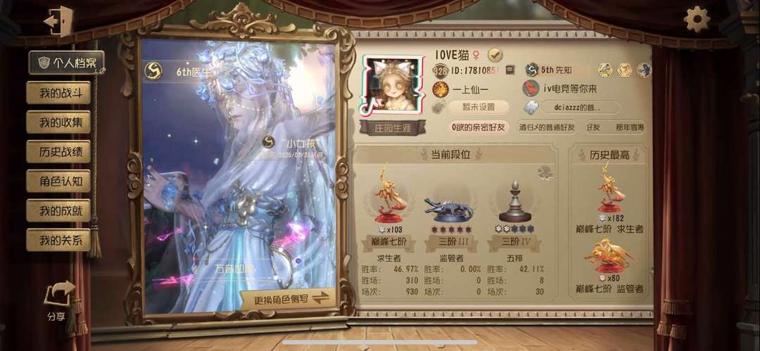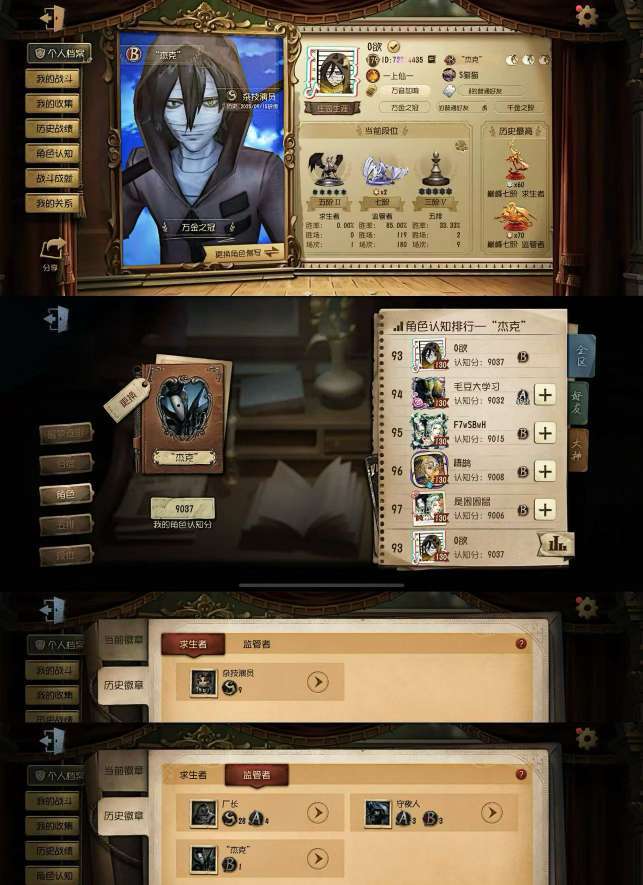装备描述:宝宝请勿直拍禁止直拍 租V号A夹0绿8泡2泡7宝00 苹果/安卓双区可转端 现S1双牌S1杂技S1守墓A12囚徒人榜前10名巅峰200星国服双S1+1A牌在榜3个现牌 历史S园丁S杂技S囚徒S守墓A记者A厂长B杰克。 现3S牌S先知S幻灯师S医生A机械师人榜第52名巅峰130星国服在榜3S牌+1A牌4个在榜现牌 历史S小女孩S勘探S前锋S先知S气象S医生S古董S空军S厂长A击球A机械师A幻灯师B佣兵 现榜A守夜历史S杂技S厂长A守夜 。 现A牌守夜人巅峰70星历史S杂技S厂长A守夜A杰克历史双巅峰4历史标 。 现B牌愚人金巅峰50星历史标S古董S拉拉A守夜B愚人金B牌雕刻 历史人屠双百星5历史标。 历史百星监管S厂长。 个人号出租欢迎有礼貌素质好的宝宝租号