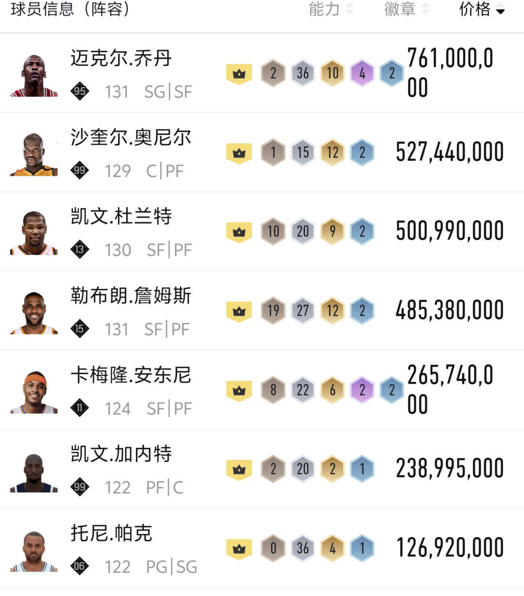 装备描述:37亿阵容,满突双时刻95乔丹詹姆斯杜兰特奥尼尔,小时刻11安东尼加内特帕克,可排位