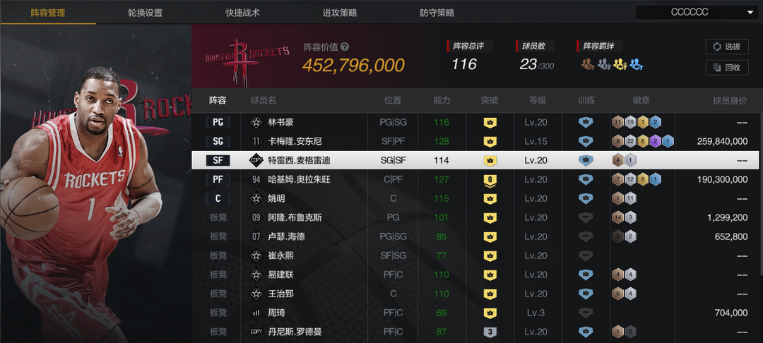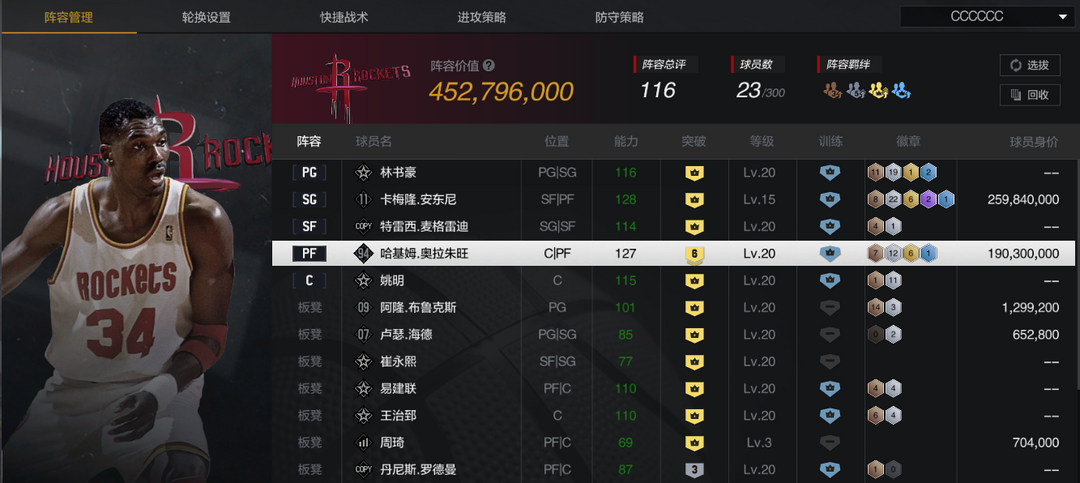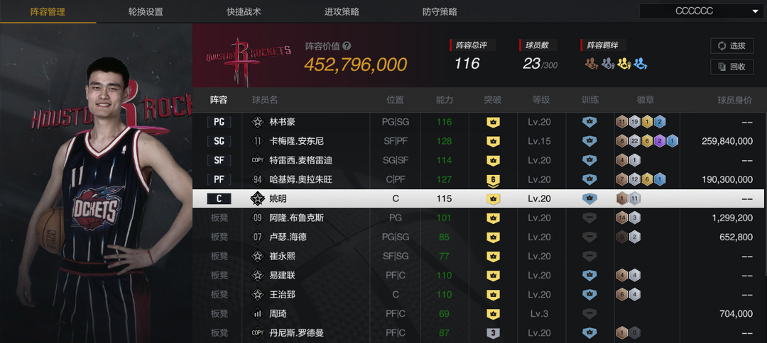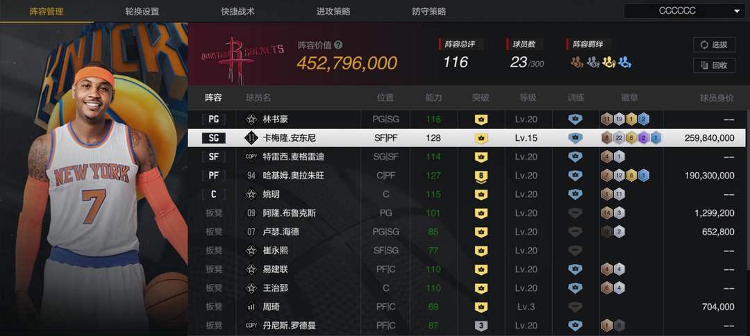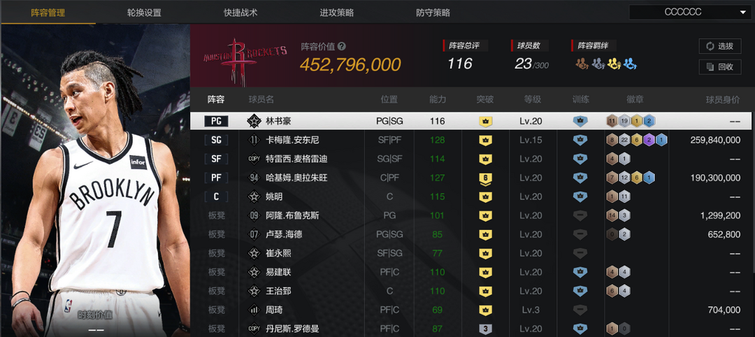 装备描述:【10纽约甜瓜】【10复刻麦迪】【时刻书豪】【6突2星大梦】【收藏姚明】【火箭套】【六收藏】